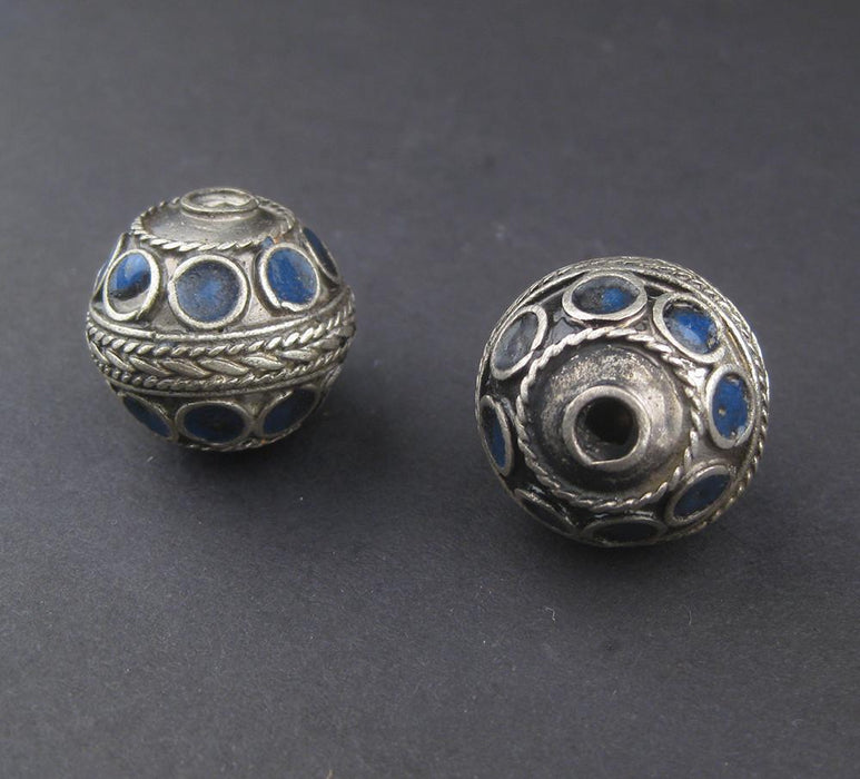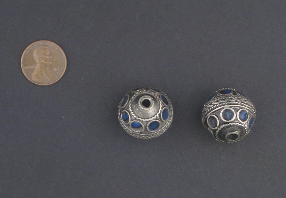 These silver-plated metal Berber beads are decorated with intricate wire designs and colorful blue enamel. They measure 22 mm in diameter by 21 mm wide and are sold as a set of two beads.