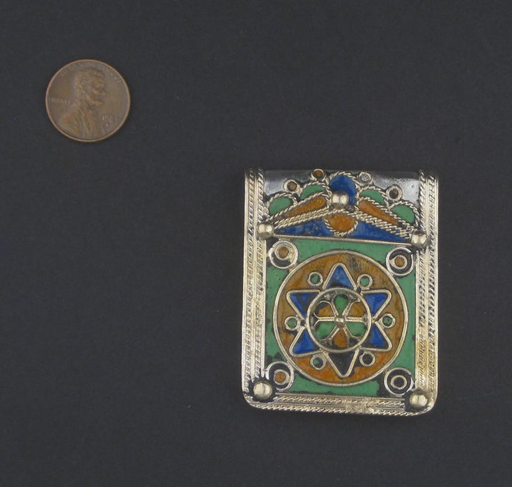 Unique pendant with unusual design. This enameled pendant is decorated with several colors and made using traditional techniques known to have been used by Jewish metal smiths. Jews are known to have lived in Morocco for nearly 2000 years and in historic terms were known for the talent at working metal and making jewelry. To this day, many artisanal metal designs are inspired by their ancient tradition. Shade of orange, and curvature of star's points may vary slightly from photo as well as ratio of length to width.