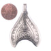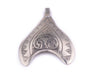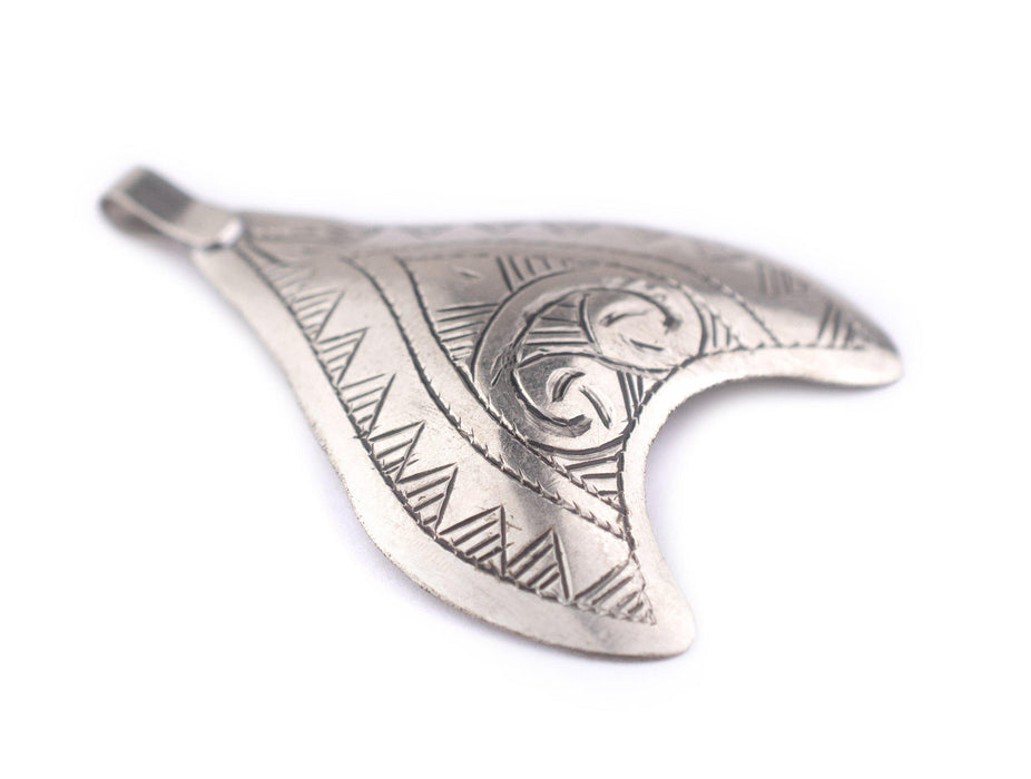This artisanal silver-washed engraved pendant was made by a craftsperson in Northern Morocco. The fish tail design is unique and sure to make a statement. Each pendant measures approximately 51 x 35mm and may vary slightly from picture.