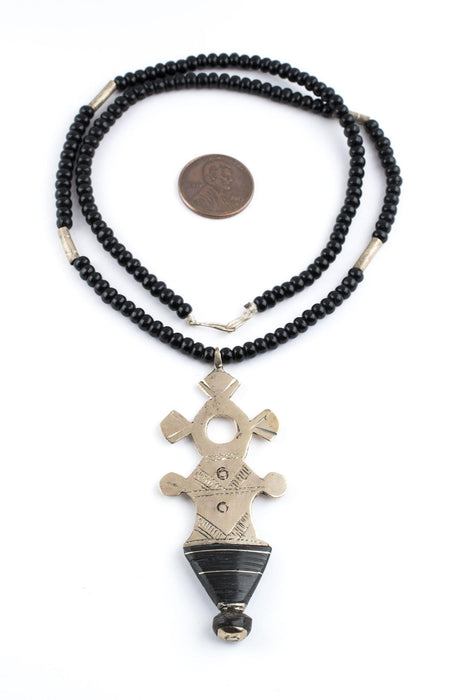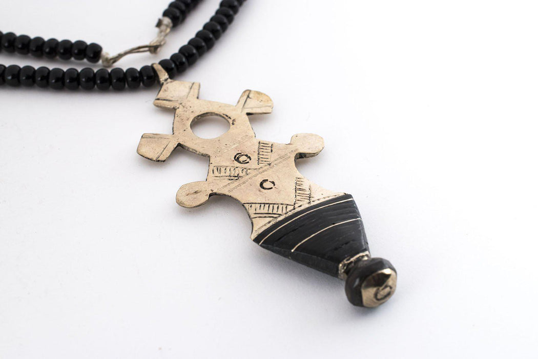 This beautiful pendant was crafted in Niger West Africa by the Tuareg people. The Tuareg are a nomadic desert tribe that inhabits a broad expanse of territory stretching from the edges of the Saharan desert of Morocco to the north as far as Burkina Faso in the south. Each pendant has been individually fashioned in a traditional motif with ebony wood. Each pendant measures approximately 70 x 29mm in size and has been strung with beads and clasp. Wear the necklace “as-is” or remove the pendant and include as a centerpiece in your own original design! Each pendant is unique and may show some minor variation from picture.