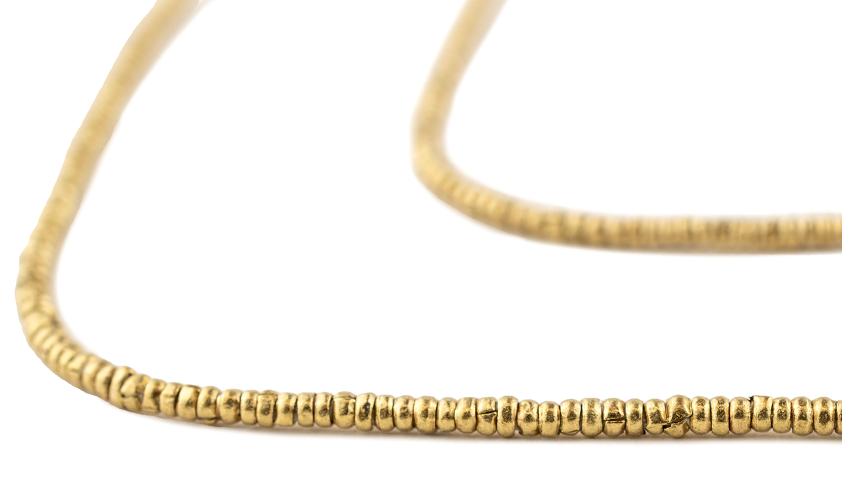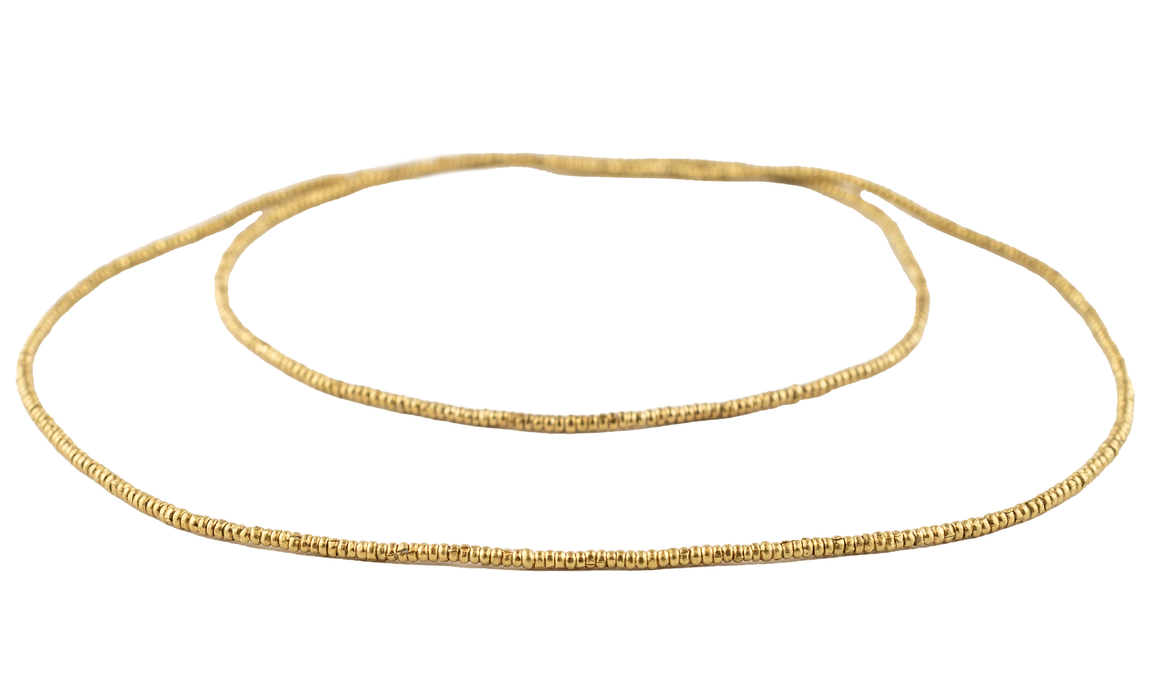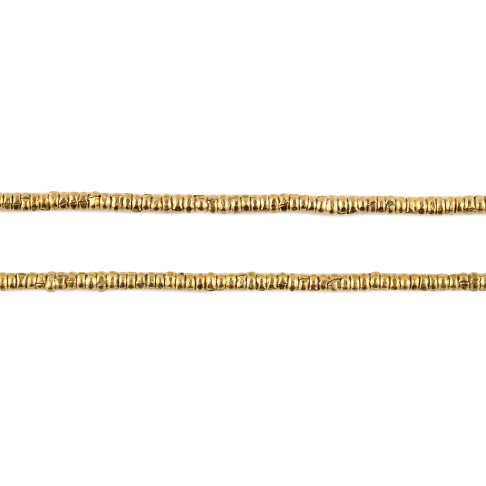 Beautiful strand of Small Brass Heishi beads from Ethiopia!. Beads measure 1mm wide by 2mm diameter. Each strand is approximately 30 inches long with hole size of 1.5mm. Two strands are pictured. Strands are sold individually.