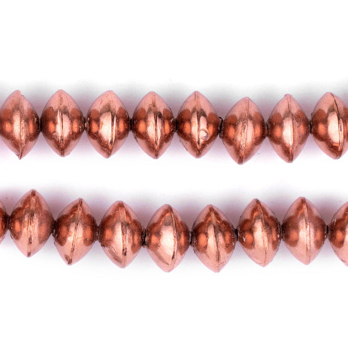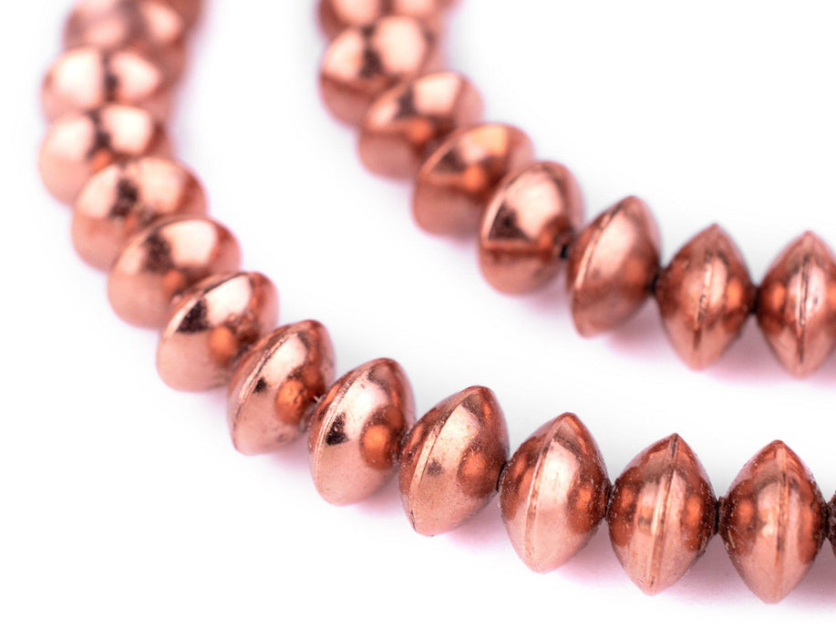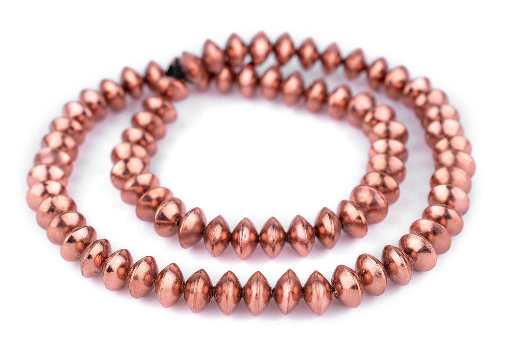 These great saucer-shaped beads are bold and versatile. Each bead measures approximately 8 x 12mm, with a hole size of 2mm. Strands measure 24" inches in length. Look carefully to see the high quality of the workmanship, smooth finish, and rustic character. The hollow design of these beads makes them lighter than they look, without compromising quality. Try some today and see for yourself! This artisan product is made using premium copper electroplating over brass to make these copper finish customer favorites.