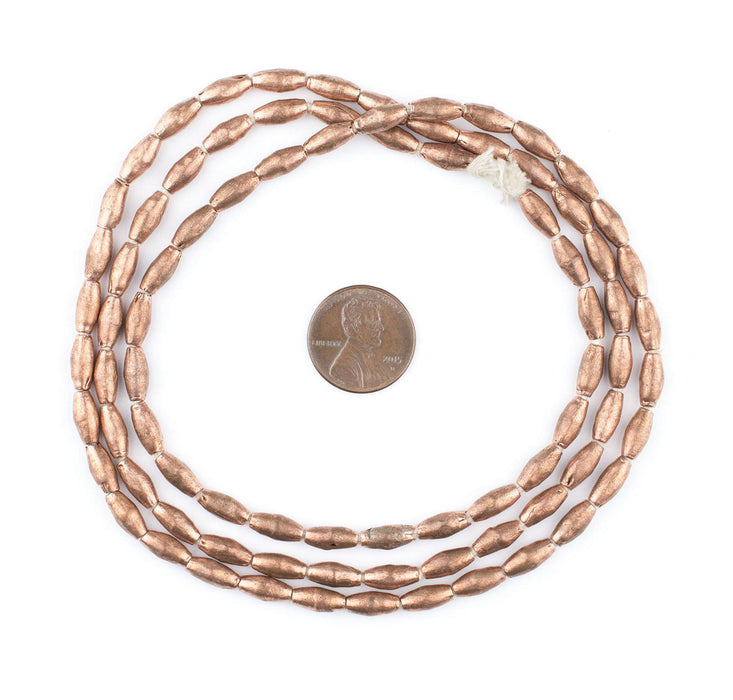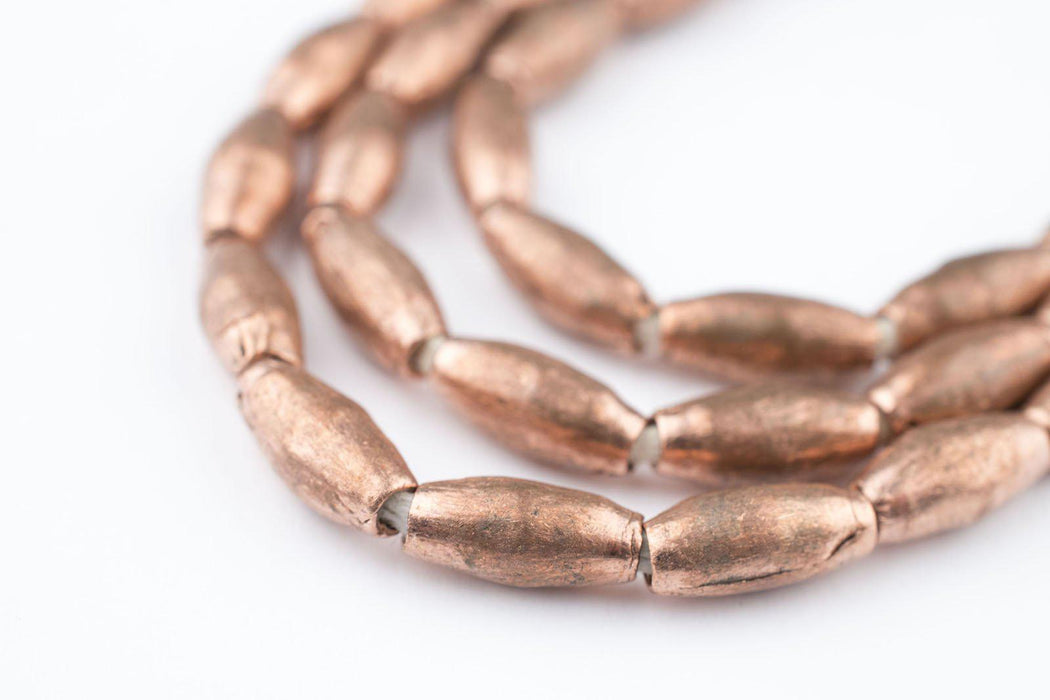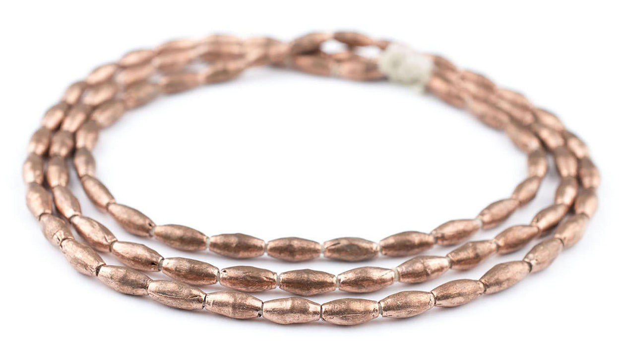 Admire this great strand of copper Ethiopian oval metal beads. These beads have been individually fashioned by hand which lends to them a unique and rustic character. Beads such as these are made by in the workshops of villages artisans from where they are subsequently collected and brought to market. The versatile quality of these beads makes them great for myriad jewelry designs. Use them as spacers, accents, or even wear “as-is”. Each strand measures 32" with individual beads measuring approximately 9-10 x 4mm and hole size of 1mm. Order your strand and see the quality of these beads for yourself today!