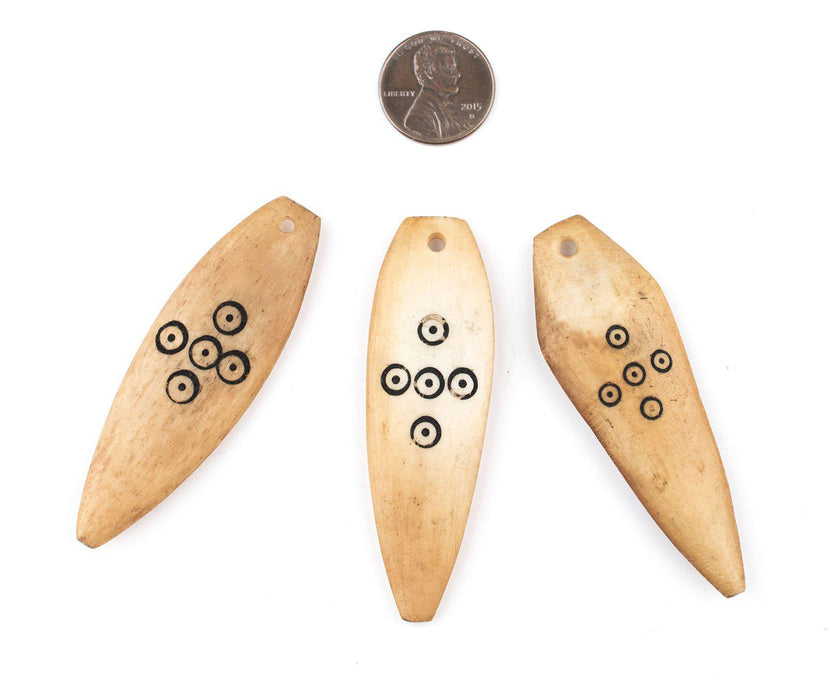 This unique hand-carved shaman medicine stick from Ethiopia is made from camel bone. The medicine stick is intended as protection from the evil eye and is used by the shaman for prophecy and healing. Each medicine stick is a little bit different and measures approximately 55-89 x 22mm. Size and pattern may vary slightly between pendants. Some pendants have more pattern than shown in photo. Several representative pendants are shown in photo. Each medicine stick is sold individually.