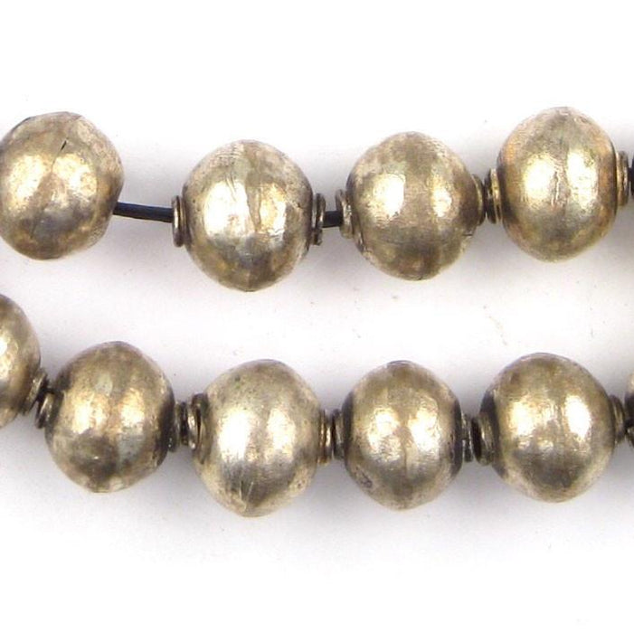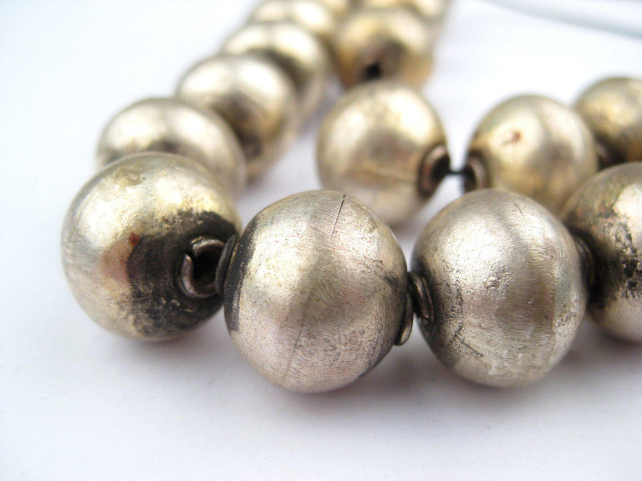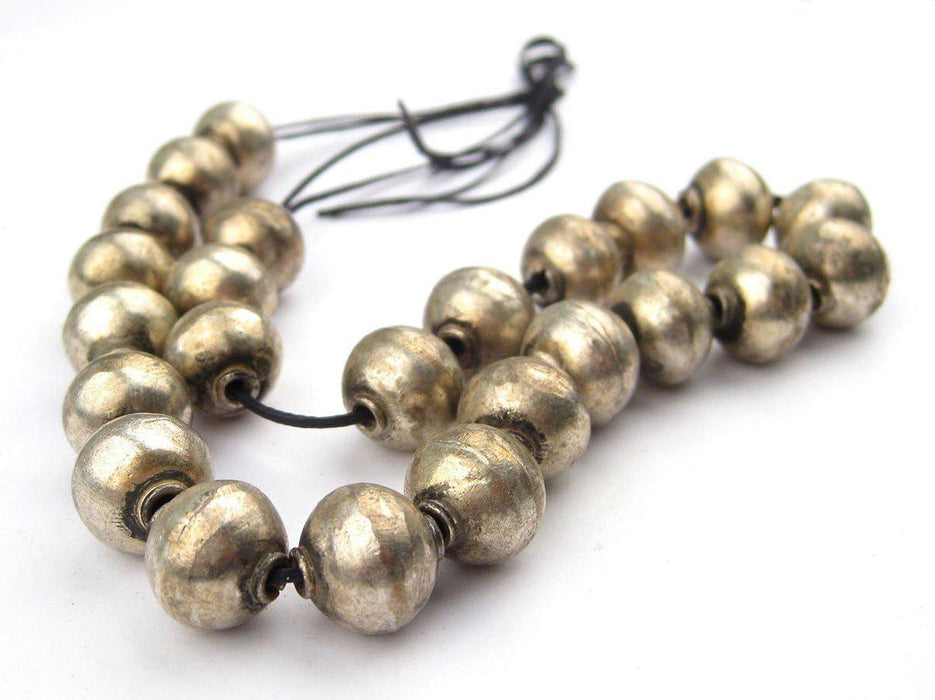 Admire this strand of artisanal Ethiopian white metal beads. Individually fashioned by an expert craftsmen, these round beads measure 12-13 x 14mm with approximately 20 beads per strand. Light-weight and versatile these special beads will add character to your original designs. Each strand is unique and may vary slightly from strand pictured.