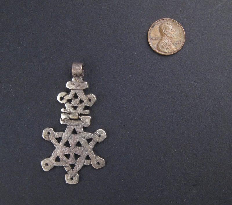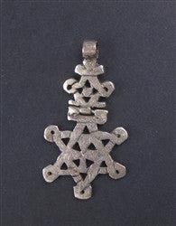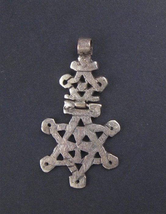 This Ethiopian Coptic Star of David is made in the Jewish tradition of Ethiopia, and would make a beautiful necklace...all you have to do is run a chain through it! This unique one of a kind cross is made with a silver alloy. The design on the back of the pendant is similar to the design on the front. This unusual pendant is APPROXIMATELY 2.5-3" in length.