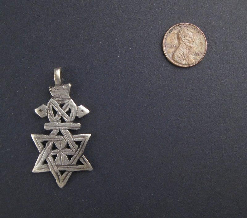 This Ethiopian Star of David is made in the ancient Jewish tradition of Ethiopia, and would make a beautiful necklace...all you have to do is run a chain through it! The cross is made with a silver alloy and measures approximately 1.5-2''. Judaica such as this is difficult to find.