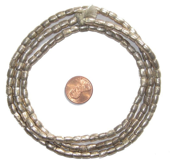 Beautiful strand of Folded Metal Plate Cylinder Beads from Ethiopia! The strand measures 34" in length, and beads measure approximately 4mm in diameter by 6 mm in length.