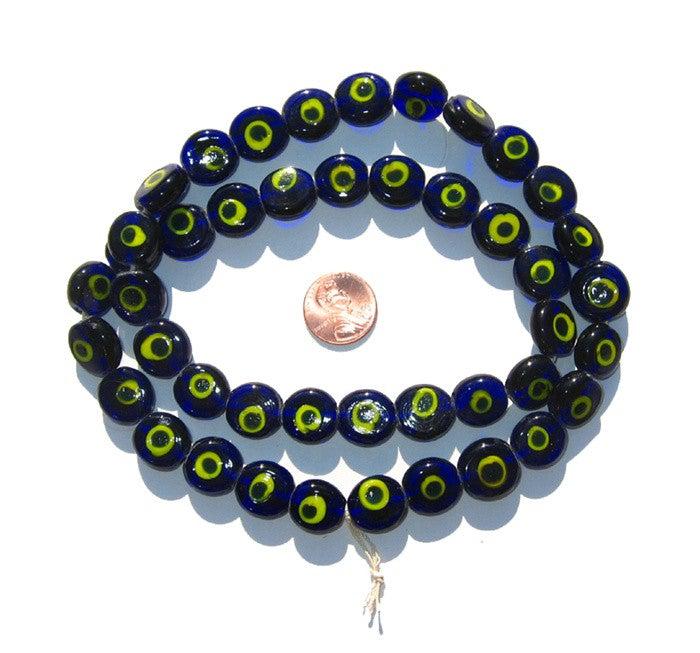 These are traditional EVIL EYE beads used in many middle eastern cultures. These beads are worn so that the "eye" may shield the owner from evil. The strand is 24" in length.