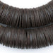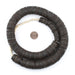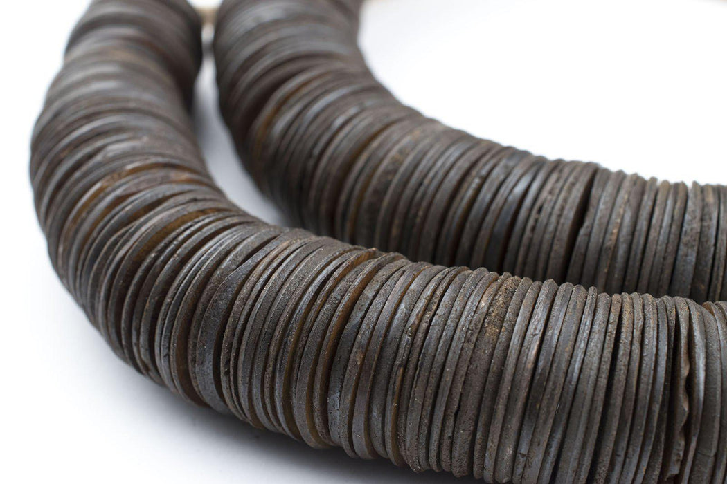 These black bone heishi beads are designed in the spirit of traditional Nigerian coconut heishi. While these beads seem nearly identical to their wooden coconut counterparts, do not be fooled. They are made of authentic recycled bone. While they look the same, they are more durable and a bit heavier than the traditional coconut beads. Each bead measures approximately 2-3 x 17-20mm, with a hole size of 2-4mm. Strand length is approximately 25". Truly a unique find!
