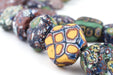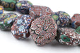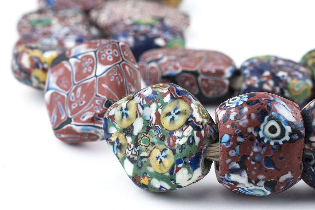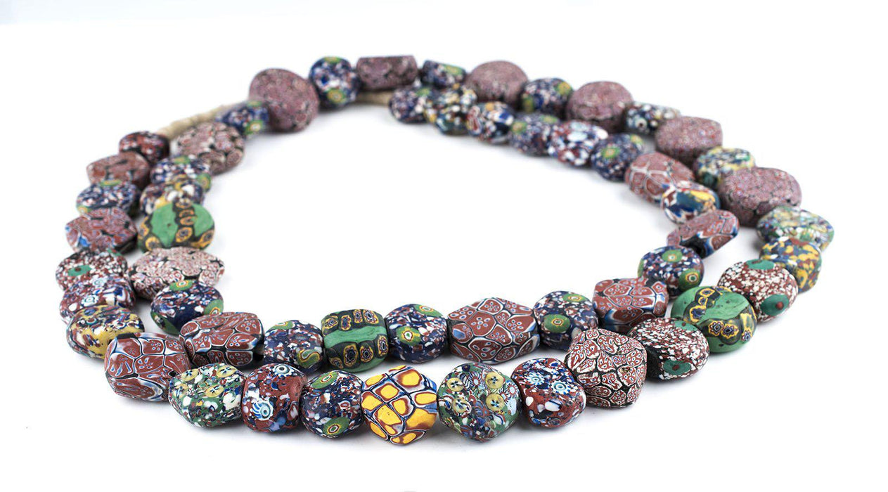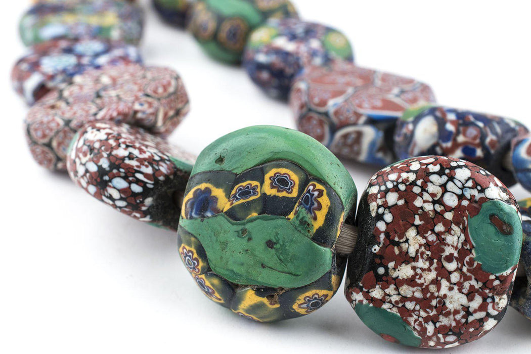 WOW! Take a look at this unusual strand of tabular-shaped Venetian Trade Beads. The strand consists of several exceptionally rare varieties of beads including including flat Millefiore beads and Murrine Beads with a more mottled appearance. Millefiore beads are made by inlaying a mosaic cane with a flower design whereas the Murrine bead is made using glass chips on wound glass core. These beads are likely of early 20th century provenance however their exact age is not known. This is an extremely long strand measuring approximately 51" in length. Note the size of the penny relative to the strand. Individual beads measure between 16-27mm in width by 22-33mm in diameter, and 10-14mm in thickness. You will receive the exact strand pictured. This is truly a unique piece!