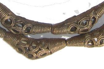Take a look at these Brass "Elbow" trade beads from Africa. Each bead is made individually through the "Lost Wax process" technique. The strand is approximately 30", with beads measuring approximately 15 by 38 mm in width and length respectively. Each strand may have 1-2 beads that are less than perfect.