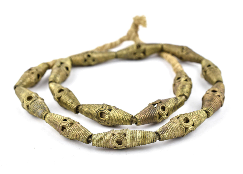 Take a look at these bicone-shaped Ghana Brass Trade Beads from Africa. Each bead is made individually through the "Lost Wax process" technique. This strand is about 28", with beads measuring approximately 35-40 x 11-12mm. Each strand may have 1-2 beads that are less than perfect and may vary slightly from strand pictured.