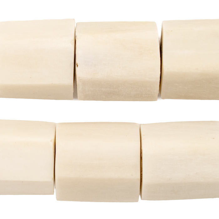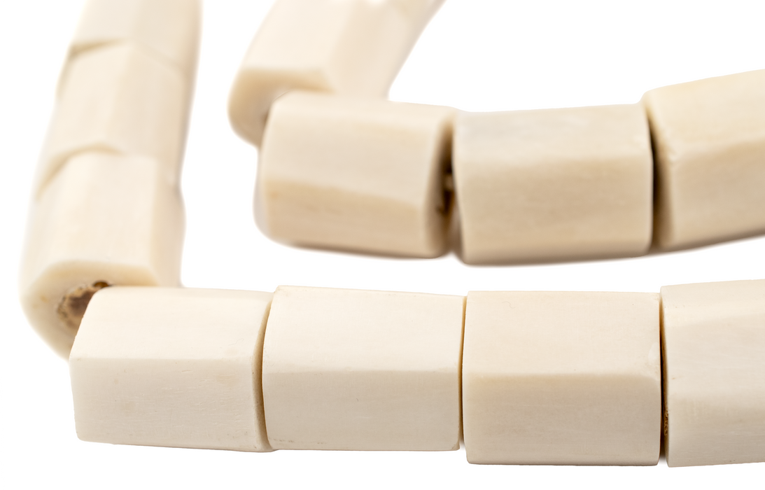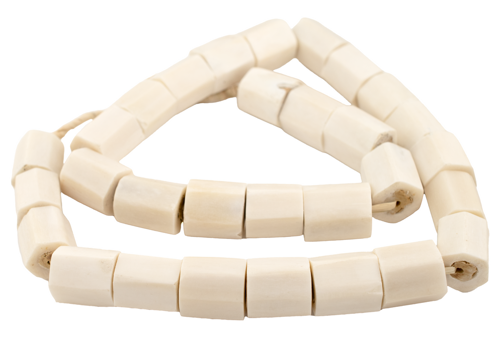 Admire this unusual strand of bone beads from Kenya. While Kenyan bone beads are common in a variety of shapes and styles, these beads come in a more unusual faceted cylinder shape. East African bone beads are handcrafted by artisans using recycled cow bone. Each bead is individually carved and polished, and is truly one of a kind.