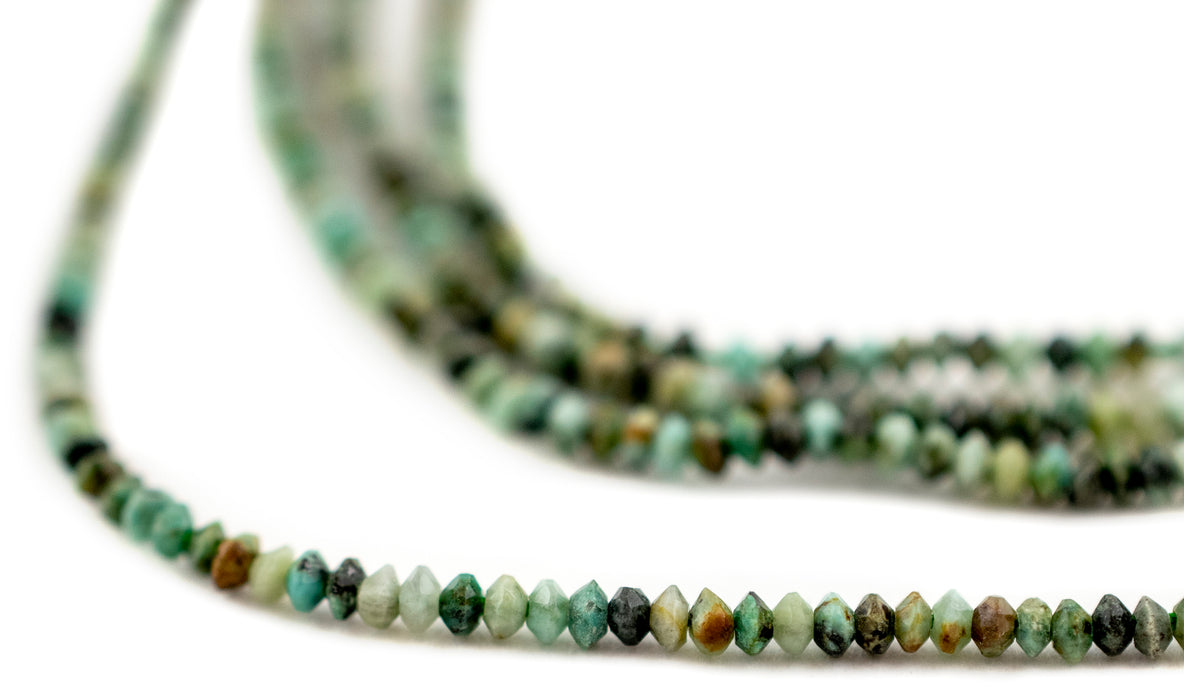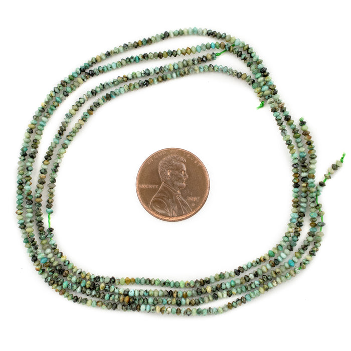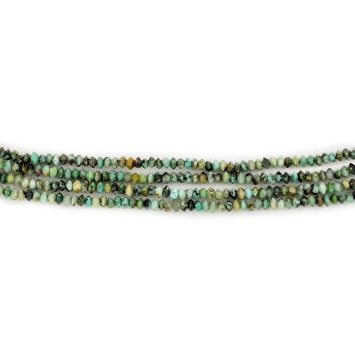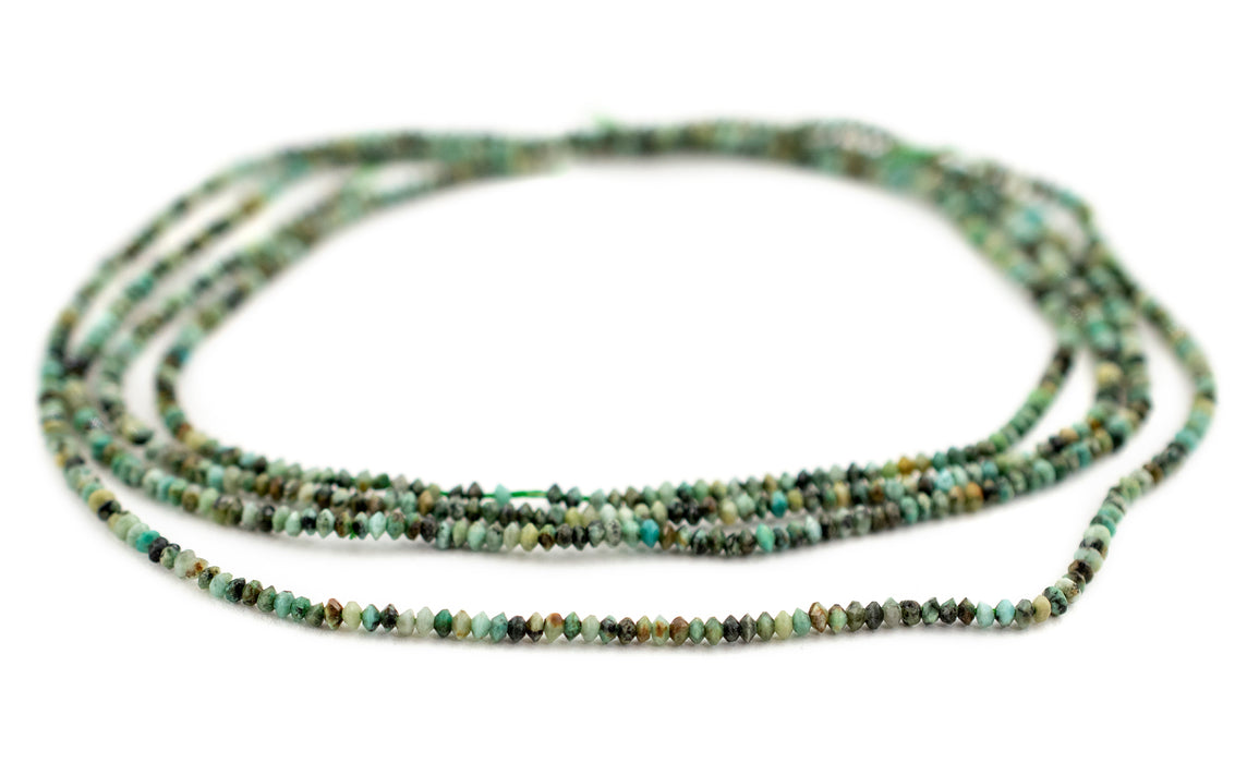 Check out this amazing strand of stone beads made of authentic turquoise. This brilliant and unique color will add an unmistakable accent to your jewelry designs. These beads are cut and polished in a faceted heishi shape. Turquoise stone has been treasured since time immemorial as a protective talisman. Each bead measures approximately 1 x 2mm, with a hole size of approximately .5mm. You will receive one strand measuring approximately 15". There are around 300 beads on each strand. Multiple strands pictured. Each strand sold individually. Beads may vary slightly from photo. Grab a few strand for yourself today!