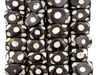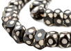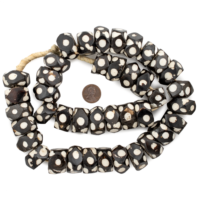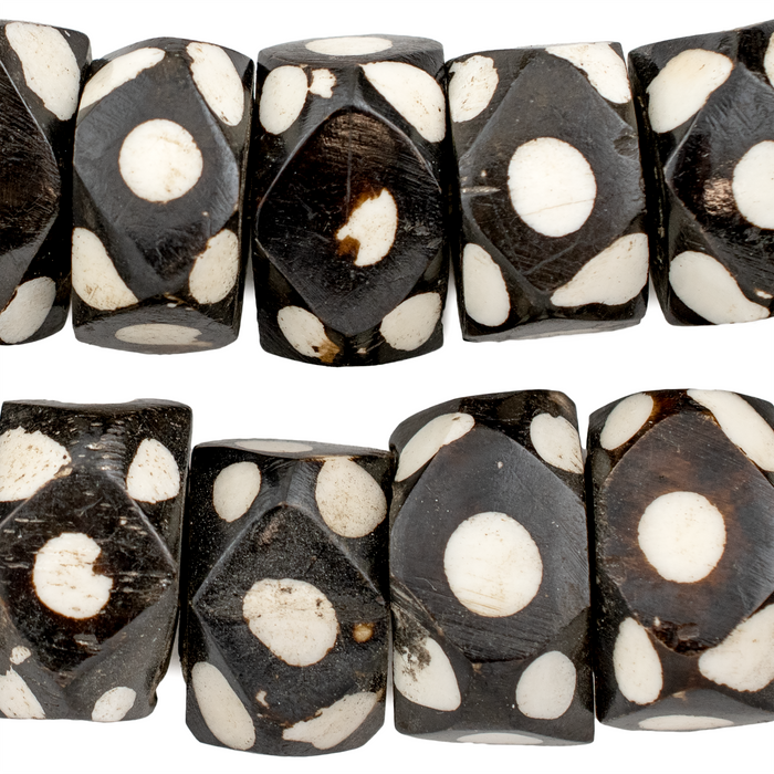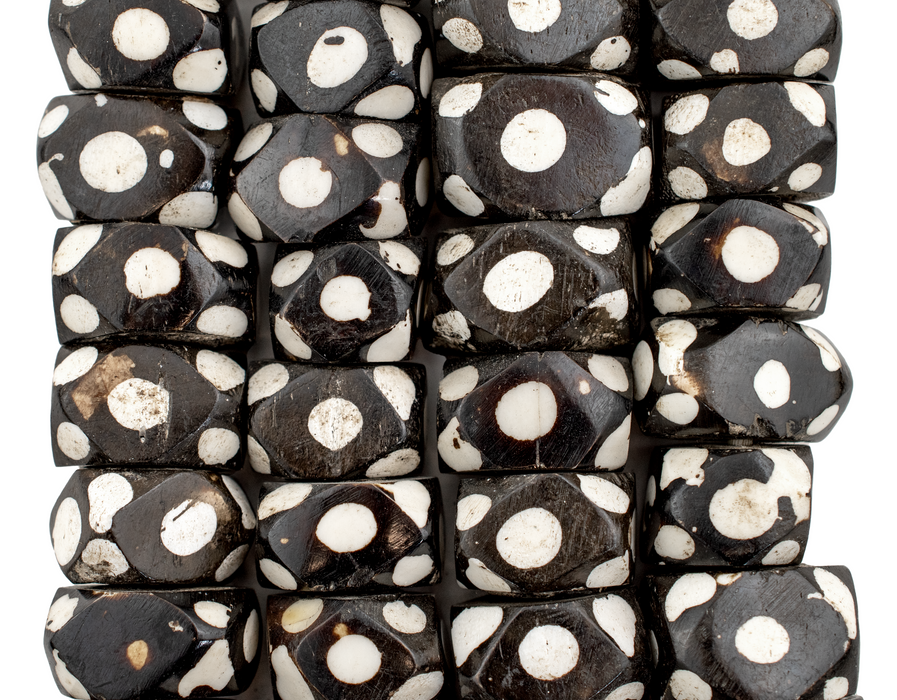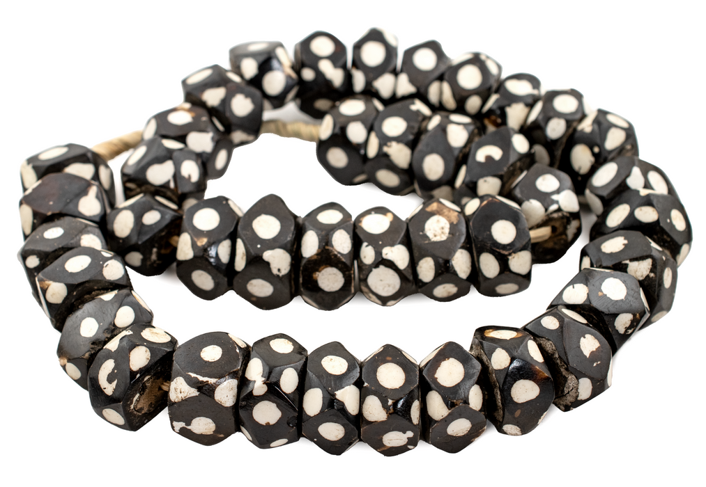 Checkout these beautiful large bone batik from Africa! They are hand dyed beads from Kenya, Africa. The dying method is known as "batik", which is a wax relief process. These beads are strung on sisal and could even be worn as is. This is an unusual modern faceted polka dot design! Due to the handmade nature of these beads some beads may have a wood core that is more secure than others.