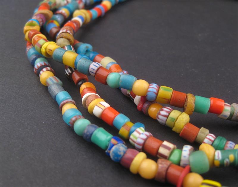 Bright, beautifully colored glass trade beads with an occasional plastic spacer bead. Originally made in southern Spain and Venice especially for the African trade. Tribes would keep these beads as heirlooms for generations. They are now being accumulated in Nigeria and Ghana by the bead, and restrung for your beading projects. Strand lengths will measure 36 inches in length. Two strands shown however each strand is sold individually.