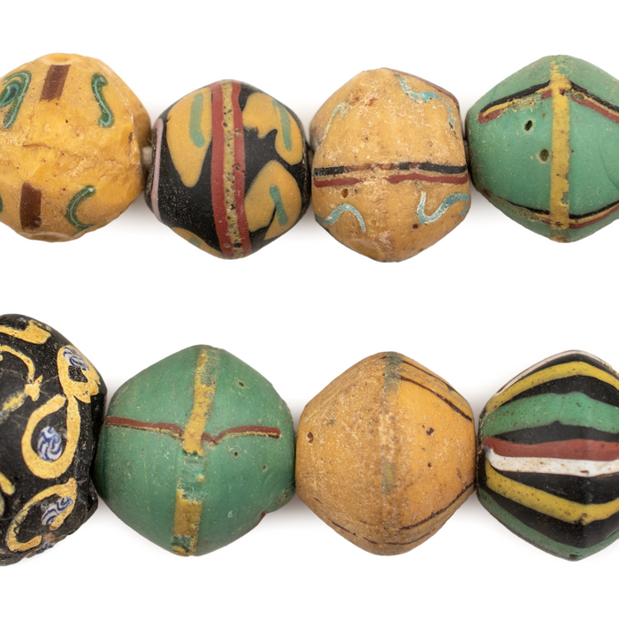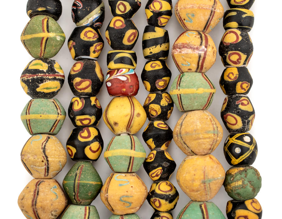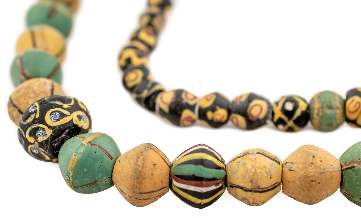 One of the most iconic beads of West Africa, King Beads likely derive their stately name through their association with the wealth and status of Tribal chiefs & African royalty. Originally of Venetian origin, King Beads were produced during the course of the 18th and 19th century and circulated by traders primarily in Ghana and Nigeria. A number patterns, designs, and sizes may be found including yellow, green, black, striped, and dotted varieties. These beads all share a characteristic bicone shape that makes them instantly recognizable. Today, King Beads are coveted by collectors and bead aficionados alike who appreciate the rich cultural, artistic, and historical legacy that these works of art represent.