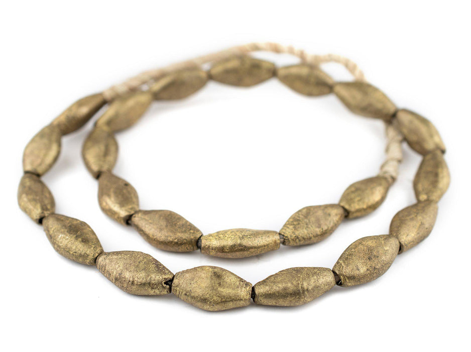 Take a look at these bicone-shaped Ghana Brass Trade Beads from Africa. Each bead is made individually through the "Lost Wax process" technique. This strand is about 26", with beads measuring approximately 22-26 x 13-15mm. These beads are handmade and will have some imperfections as shown.