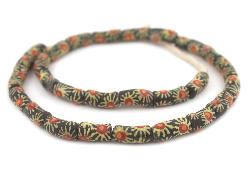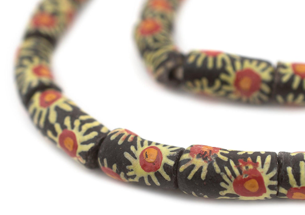 This beautiful strand of African powder glass beads was made by the people of Krobo Mountain in Ghana, West Africa. Many designs of Krobo beads are patterned to resemble old Venetian fancy trade beads. They are made from bottles and other glass items that are turned into powder, then poured into molds in order to create beads. Decorations on the beads are made with a paste made of colored glass powder and water which is applied by hand using a thin wooden stalk. The beads are cooked a second time to fix the decor. Each bead measures approximately 23-26 x 10-12mm with a hole size of approximately 3mm. You will receive a full strand measuring approximately 31". Limited supply.