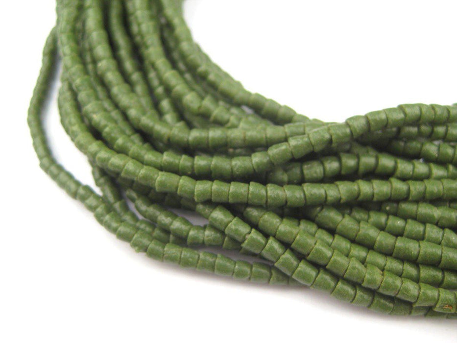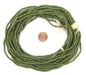 Checkout this beautiful strand of green sandcast beads from Ghana, West Africa. Beads such as these are often worn as traditional waist beads. The process of making these beads is unique to Africa and has been used for over 1000 years. Pulverized glass of various colors is poured into a clay mold, using a cassava stem for the bead's hole. The mold is placed in a furnace and heated until the glass particles congeal without actually melting and the stem burns out. The Ghanaians have been making beads in this manner since the 1600s. Multiple strands shown. Each strand is sold individually. Shade may vary slightly from photo.