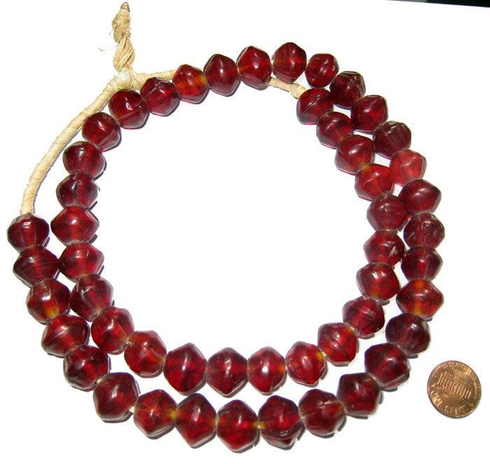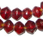 Each of these beautiful 'Vaseline' red glass beads are approximately 12 x 14mm, larger and smaller thicknesses. The strand is approx. 24 inches long, and has approx. 40-45 beads. Vaseline beads come from West Africa, and were made beginning in the early 1900's. Originally, these African beads were made from glass that was enriched in 1-2% uranium oxide in order to enhance the color, causing the green and yellow ones to fluoresce brightly under a blacklight. But the use of uranium was banned in the 1940's. These beads come from and are used in Africa.