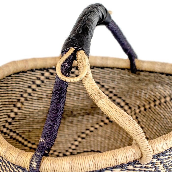 Hailing from the Bolgatanga region of Western Africa, bolga baskets have become iconic of African basketry. Woven out of Napier grass, also commonly referred to as Elephant grass, the material for these beautiful baskets is plentiful and fast growing, making basket-weaving an easy tradition for local craftspeople. Each Bolga basket we sell is handcrafted by a master artisan, and dyed in elegant designs. The top strap is wrapped in natural leather for comfort and durability. These baskets are great as home decor items, or can be used for weekly trips to your local farmers market! Each basket measures approximately 15-17 x 16-18". You will receive 1 basket per order. Basket may arrive in condensed form requiring several hours of sitting time for it to expand. Each basket is handmade and hand-dyed, and may vary slightly in color and design.