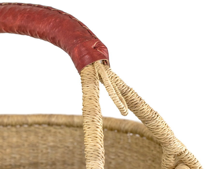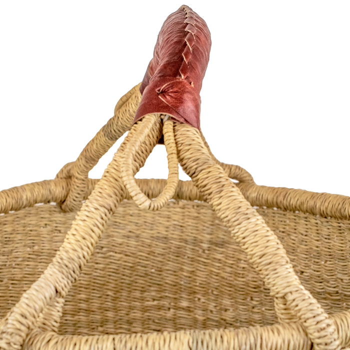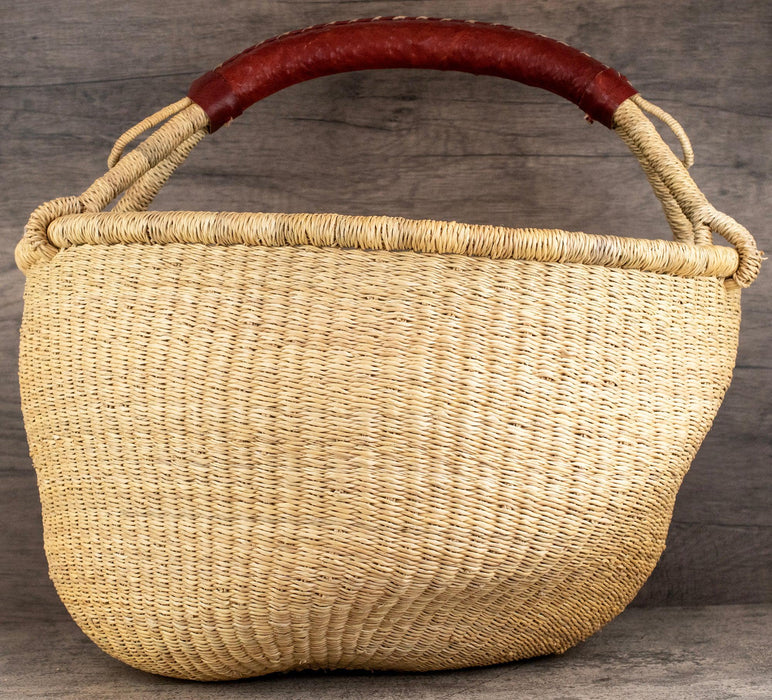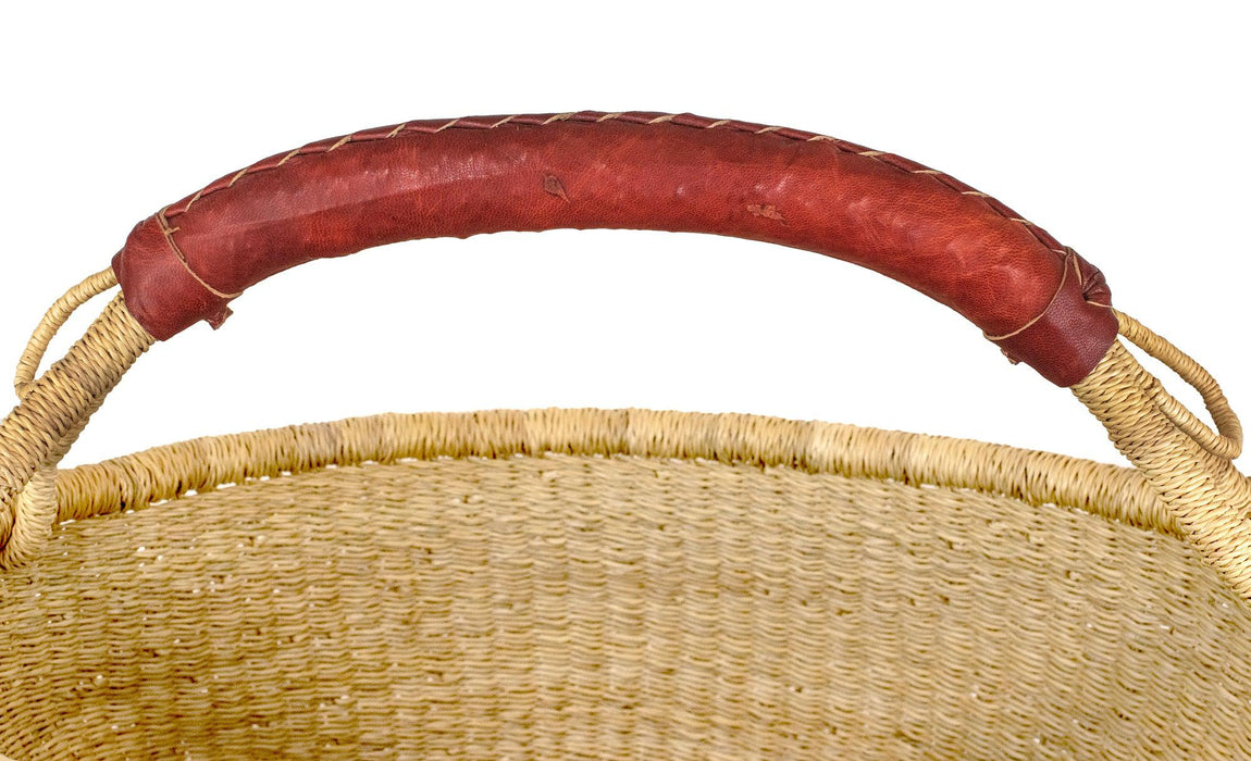 Hailing from the Bolgatanga region of Western Africa, bolga baskets have become iconic of African basketry. Woven out of Napier grass, also commonly referred to as Elephant grass, the material for these beautiful baskets is plentiful and fast growing, making basket-weaving an easy tradition for local craftspeople. Each Bolga basket we sell is handcrafted by a skilled artisan. The top strap is wrapped in natural leather for comfort and durability. These baskets are great as home decor items, or can be used for weekly trips to your local farmers market! Each basket measures approximately 15-17" x 17-19". You will receive one basket per order. Basket may arrive in condensed form requiring several hours of sitting time for it to expand.