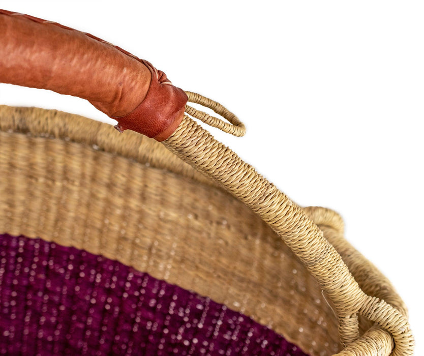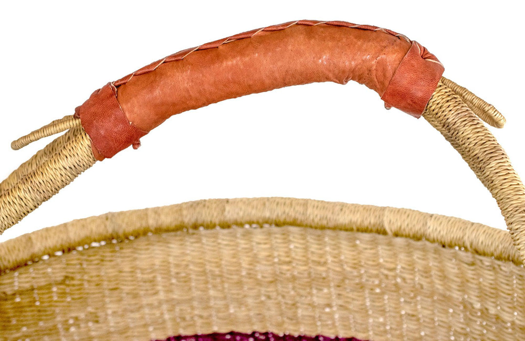 Hailing from the Bolgatanga region of Western Africa, bolga baskets have become iconic of African basketry. Woven out of Napier grass, also commonly referred to as Elephant grass, the material for these beautiful baskets is plentiful and fast growing, making basket-weaving an easy tradition for local craftspeople. Each Bolga basket we sell is handcrafted by a master artisan, and dyed in elegant designs. The top strap is wrapped in natural leather for comfort and durability. These baskets are great as home decor items, or can be used for weekly trips to your local farmers market! Each basket measures approximately 15-17 x 16-18". You will receive 1 basket per order. Basket may arrive in condensed form requiring several hours of sitting time for it to expand. Each basket is handmade and hand-dyed, and may vary slightly in color and design.