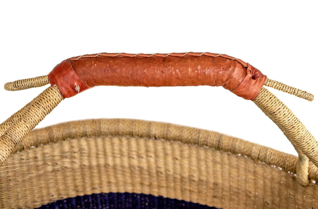 Hailing from the Bolgatanga region of Western Africa, bolga baskets have become iconic of African basketry. Woven out of Napier grass, also commonly referred to as Elephant grass, the material for these beautiful baskets is plentiful and fast growing, making basket-weaving an easy tradition for local craftspeople. Each Bolga basket we sell is handcrafted by a master artisan, and dyed in elegant designs. The top strap is wrapped in natural leather for comfort and durability. These baskets are great as home decor items, or can be used for weekly trips to your local farmers market! Each basket measures approximately 15-17 x 16-18". You will receive 1 basket per order. Basket may arrive in condensed form requiring several hours of sitting time for it to expand. Each basket is handmade and hand-dyed, and may vary slightly in color and design.