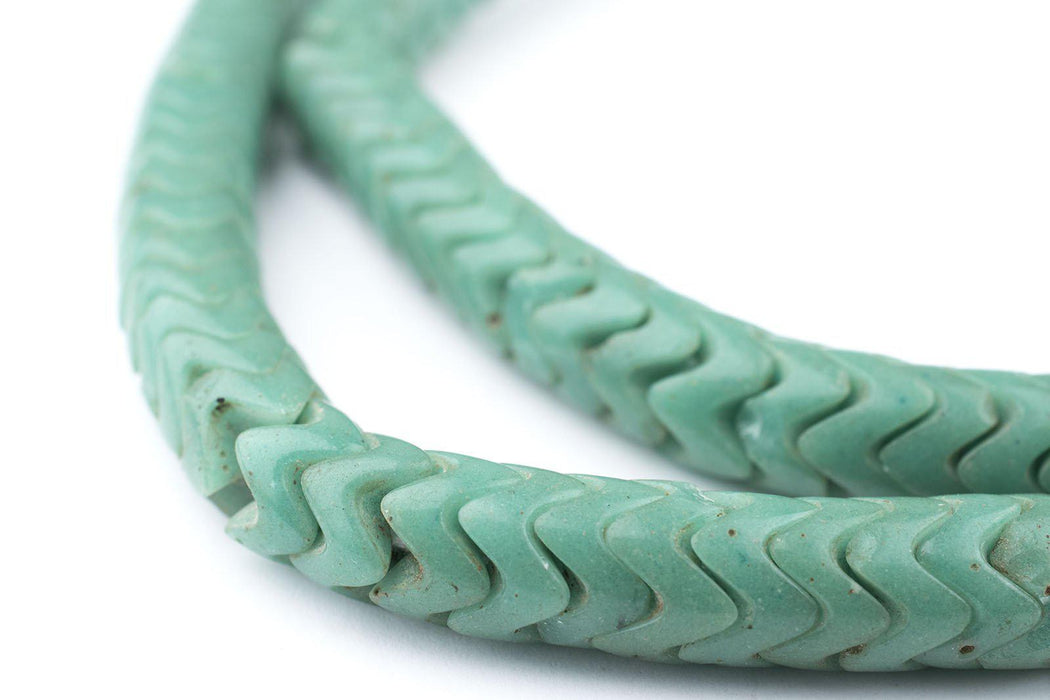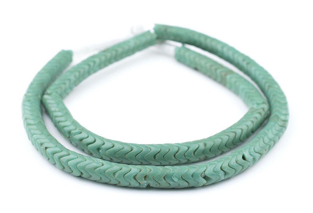 This strand of interlocking Czech glass beads is called "SNAKE" trade beads because of its similarity to the snake vertebrae.They date back from the early 1900's. These beads have been molded and the strand is in pretty good condition. It has a sea green color and is great to be used as spacers. The beads are about 8-9mm in diameter, and shade of green may vary slightly from strand to strand.