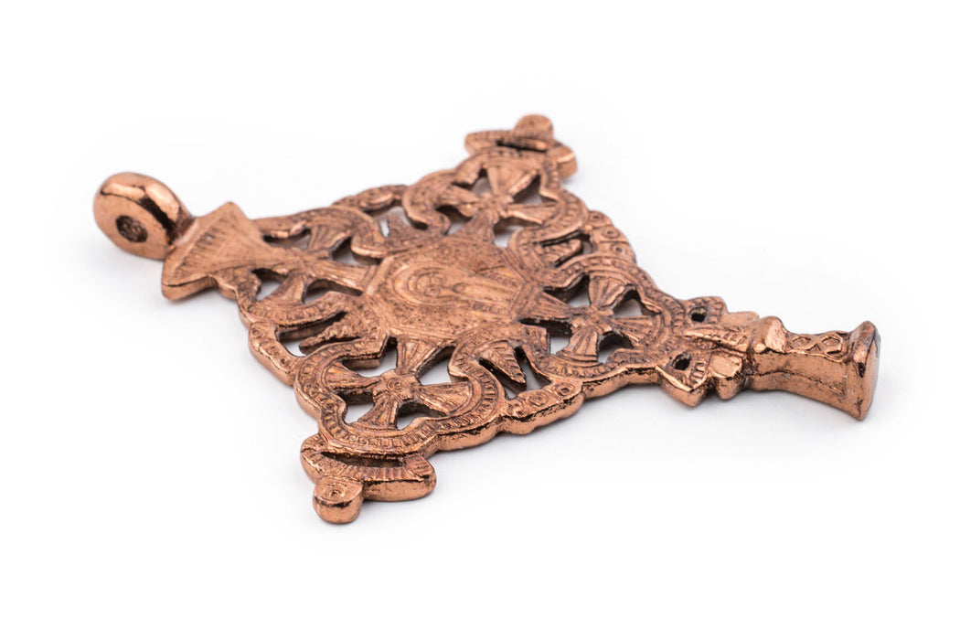 This traditional cross was hand-casted in a time-honored Ethiopian design. Cross pendants and processional crosses have long graced Ethiopian rituals and customs, and have become icons of Ethiopian culture. This African cross is of exceptional quality. Measuring approximately 100 x 80mm, this cross has a hole size of 5mm. Available in brass, silver, and copper finishes. Incorporate into your jewelry designs, or simply throw on a leather cord to wear as is! This artisan product is made using premium copper electroplating over brass to make these copper finish customer favorites.