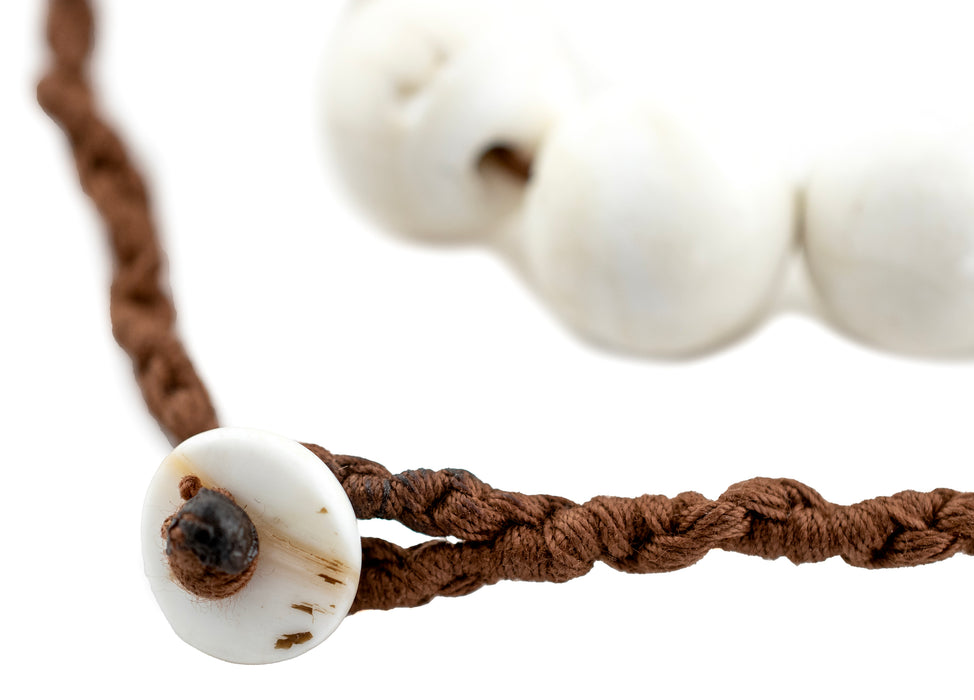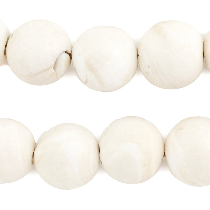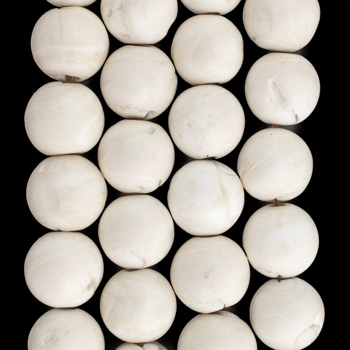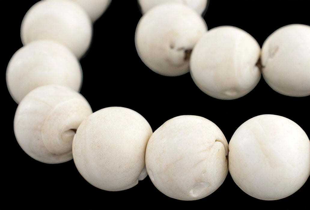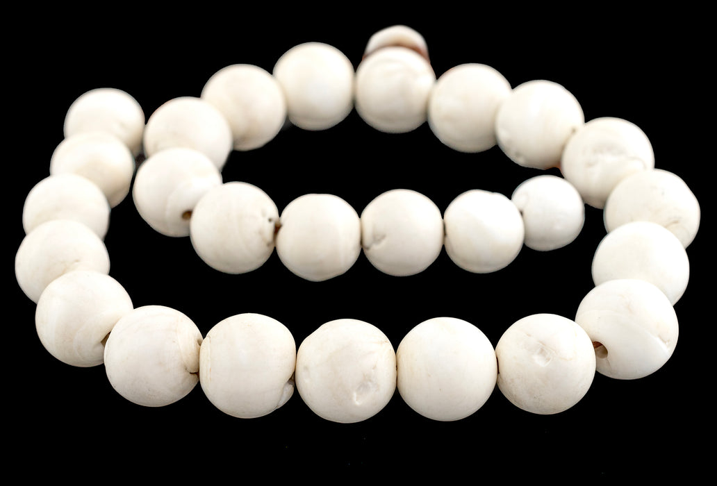 Admire the detail of these unusual beads fashioned in a round-like shape from the natural shell of the ocean conch. The material for these unique beads is said to have been traded from the Bay of Bengel north towards the Himalayan mountains. No two beads are alike however beads measure approximately 16-18 x 17-19mm with hole size of 2-3mm. Some strands may have up to 3-4 smaller beads. The length of strand measures about 24". Each strand is unique and may vary slightly from photo. Beads may be used in your own special jewelry design however the beads have been nicely strung and the strand may also easily be worn as a necklace.