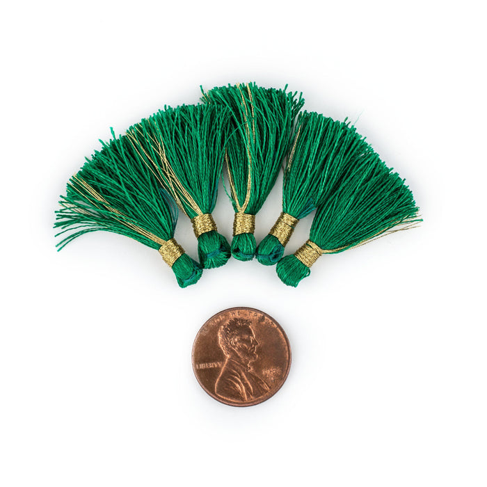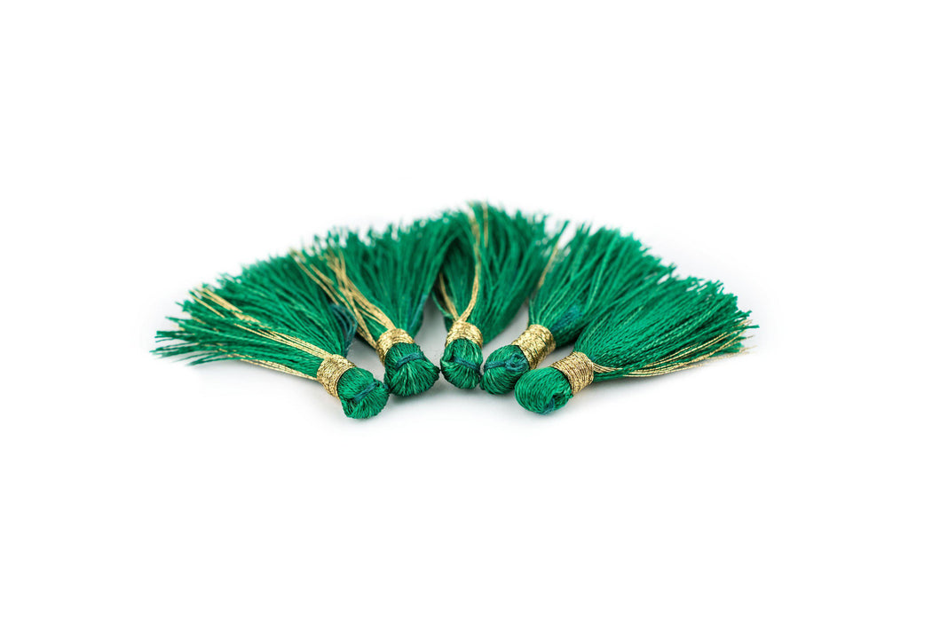 Look no further! These genuine silk tassels have been individually handmade by an expert of the craft. They are crafted from authentic Indian silk which is highly refined and world renown. Specially made for The Bead Chest, each high quality tassel is wrapped with a gold thread. Available in 20+ fun colors and 4 different sizes, you’ll find in our collection a tassel for almost every need. Each purchase of these green color tassels will ship as a pack of five pieces. Individual tassels measure approximately 3 centimeters (1.2 inches) in length. May be used in jewelry designs, home decor, and art projects galore. Mix and match your favorite styles today!