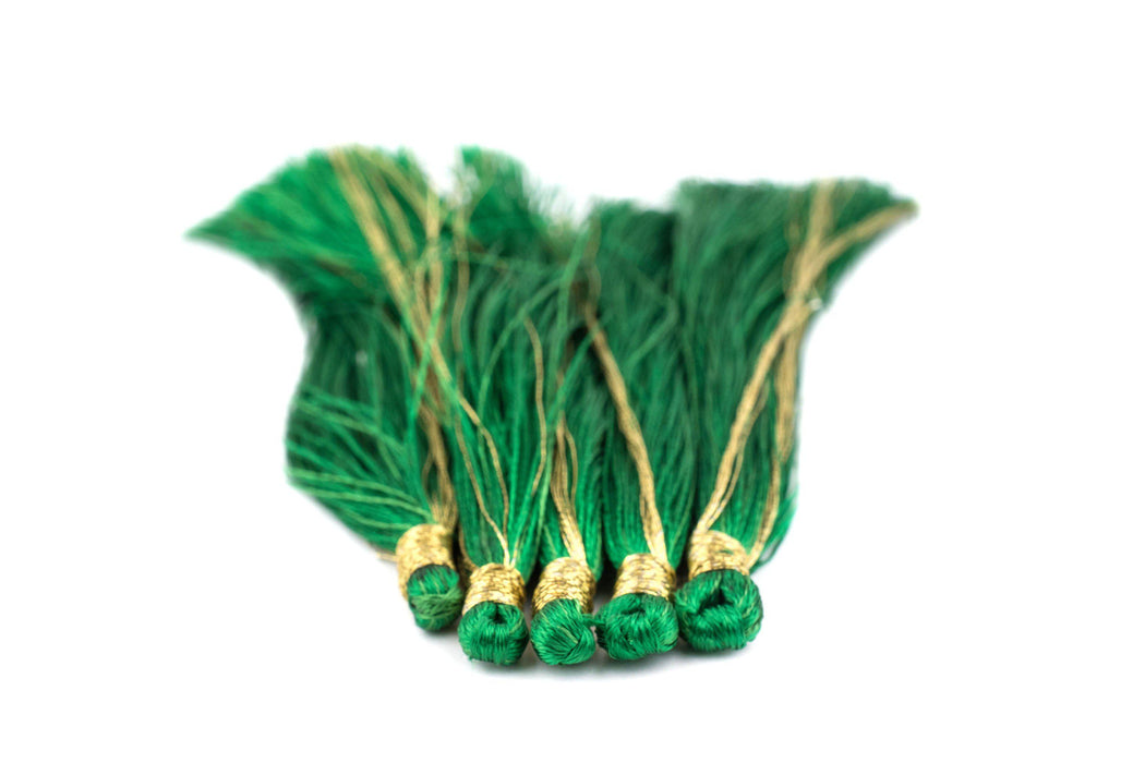 Look no further! These genuine silk tassels have been individually handmade by an expert of the craft. They are crafted from authentic Indian silk which is highly refined and world renown. Specially made for The Bead Chest, each high quality tassel is wrapped with a gold thread. Available in 20+ fun colors and 4 different sizes, you’ll find in our collection a tassel for almost every need. Each purchase of these green tassels will ship as a pack of five pieces. Individual tassels measure approximately 9cm or 3.5 inches in length. May be used in jewelry designs, home decor, and art projects galore. Mix and match your favorite styles today!