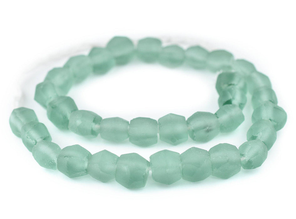 Beautiful strand of green recycled glass beads from the island of Java. These frosted beads have been fashioned in a faceted shape and come in a natural matte finish. Each bead measures approximately 12 x 11-13mm, with a hole size of approximately 2mm. Unique translucence let's light pass through. Available in a variety of shapes. Pick and choose and your favorite colors!