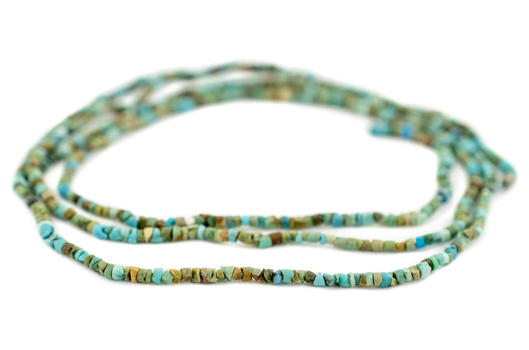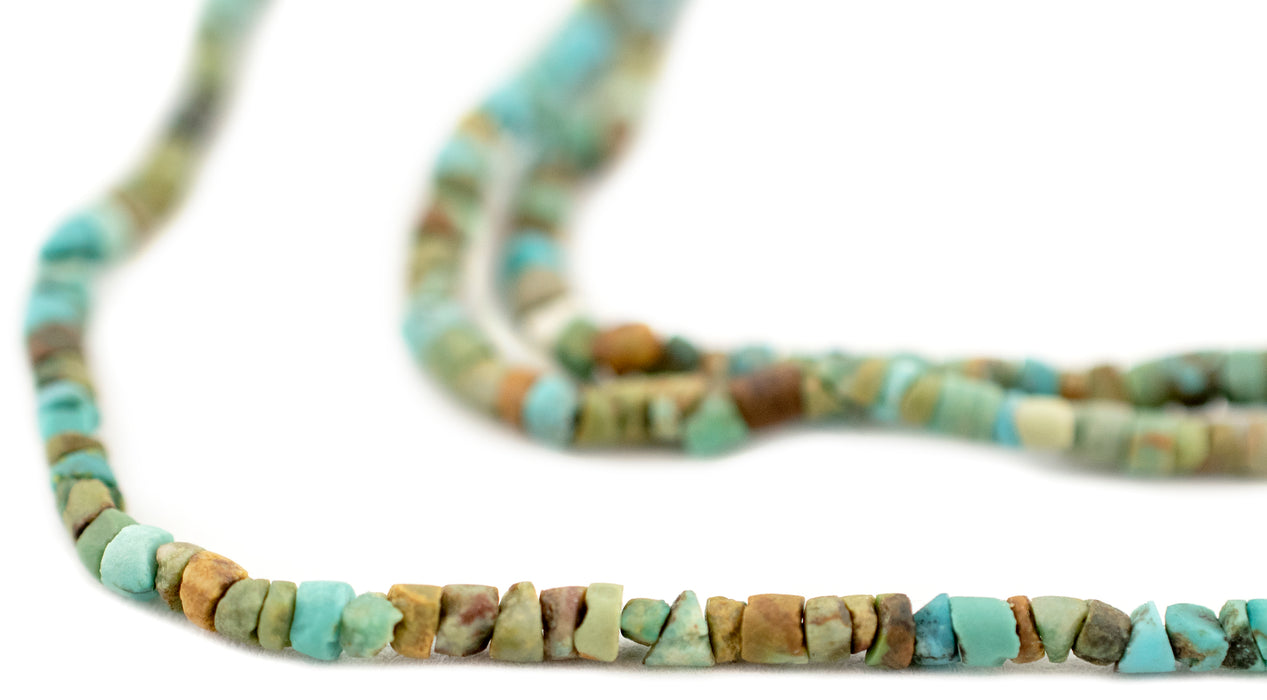 Indulge your eyes in these beautiful turquoise beads brought to you from the mountainous wilds of Afghanistan. The mineral rich landscape of Central Asia has been a source of treasured stones for at least three millennia. These delightful, handcrafted gemstone beads come in a special heishi shape, measuring approximately 1-2 x 2mm, with holes measuring less than 1mm. Each strand is approximately 14-15" long. Turquoise stone has been treasured since time immemorial as a protective talisman. Interestingly, it derives its name in the English language from the Turks who were the first to introduce it to the Western World. Add these beads to your collection today! Multiple strands pictured. Each strand sold individually.