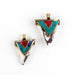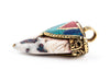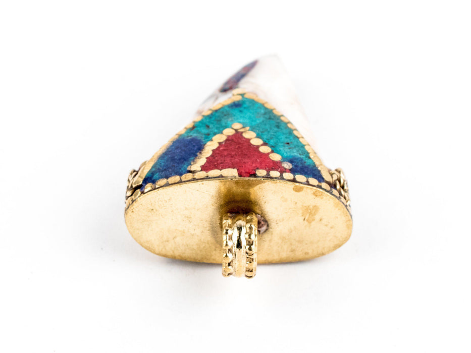 Admire this special spear-shaped pendant made of inlaid Nepali conch shell and brass. Each pendant is hand-crafted by a master artisan in the Nepal countryside by using natural conch shell which is inlaid with bits of turquoise and coral color stone. Each pendant is unique and varies in size but will measure approximately 45-50 x 30-36mm with a hole size of approximately 5mm. Simply string it on a leather cord, or incorporate it into a more intricate jewelry design. We guarantee you'll love it!