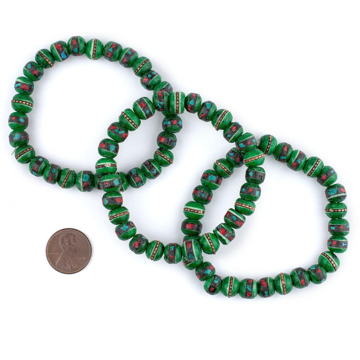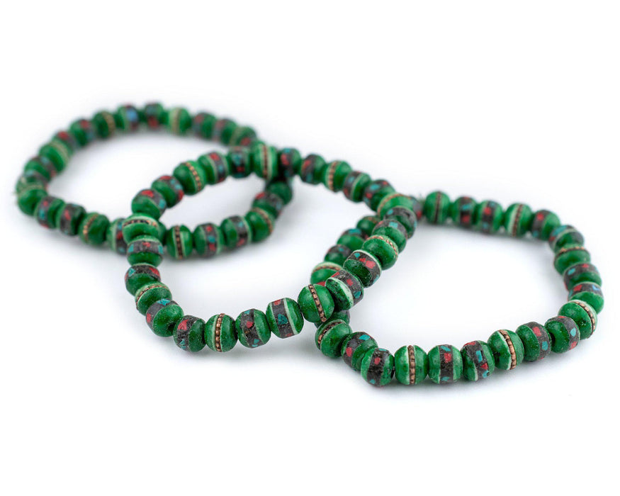 Malas are traditionally used in Buddhist culture as a part of the practice of meditation, however, today Malas are enjoyed by people around the world looking to gain mental clarity and live in the present. Our collection of Mala bracelets are handmade in Nepal using traditional inlaid beads. These beads are hand carved, inlaid with coral and turquoise style pieces, and strung 27 beads per 7.5 inch bracelet. Available in over 15 colors, choose your favorites to build your own unique stack! Beads may also be repurposed into your own unique jewelry designs. Multiple bracelets may be pictured, however each bracelet is sold individually. Shade of green may vary.