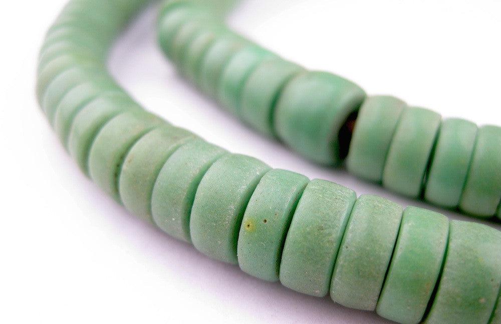 Up for sale is a nice strand of sliced green glass from Africa. These beads originated in Czech and made by pressing molten glass. They have been traded in Africa in 1900's. The strand is in very good condition and has a nice green color. It measures about 26" long with beads about 3-4 mm in thickness. It would be a beautiful addition to any beader's collection!