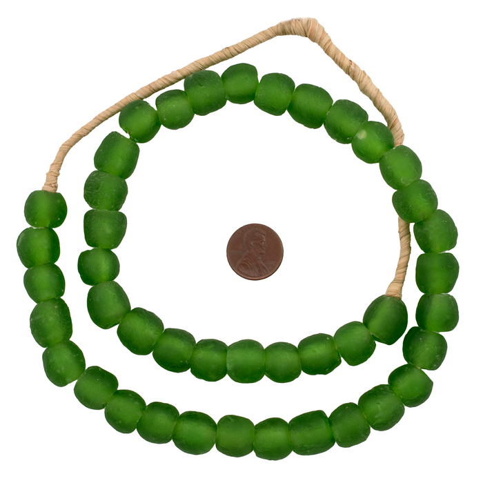 These great beads are made by the Krobo People of Ghana, Africa. Powder glass beads are made by crushing glass to a fine powder and heating it so that the particles fuse together. The glass is then poured into clay molds, with a cassava leaf stem used to make the hole. They are baked in an oven and the glass fuses and the cassava stem burns up. This technique has been used in Africa for centuries.