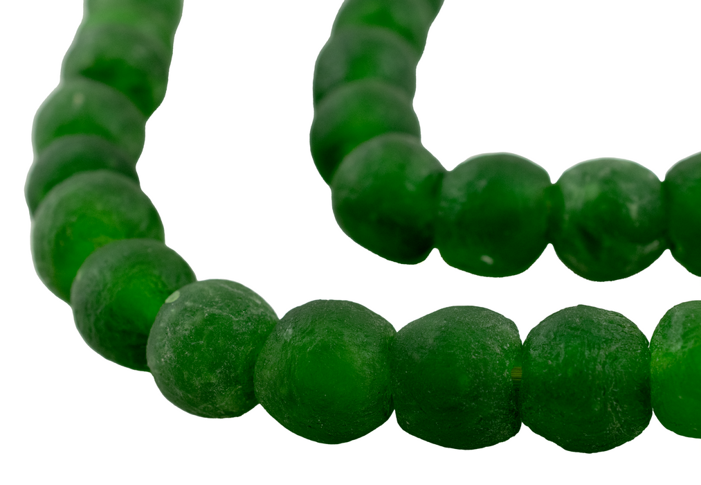 These great beads are made by the Krobo People of Ghana, Africa. Powder glass beads are made by crushing glass to a fine powder and heating it so that the particles fuse together. The glass is then poured into clay molds, with a cassava leaf stem used to make the hole. They are baked in an oven and the glass fuses and the cassava stem burns up. This technique has been used in Africa for centuries.