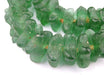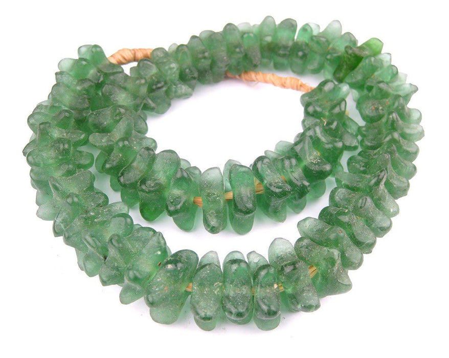 Recycled glass beads are a type of indigenously produced African bead from Ghana West Africa. These beautiful green color recycled beads are made using an old method that has been used for centuries. The glass itself is derived from a variety of recycled sources including old beverage and medicine bottles. The procedure for making the beads consists of a number of steps whereby powdered glass is poured into molds of clay and baked in a specialized oven. These beads are produced in large part by the Krobo tribe and through recycling glass are environmentally friendly. This unique star shape is rare and hard to find. Limited supply available.