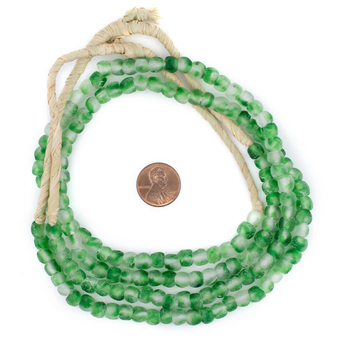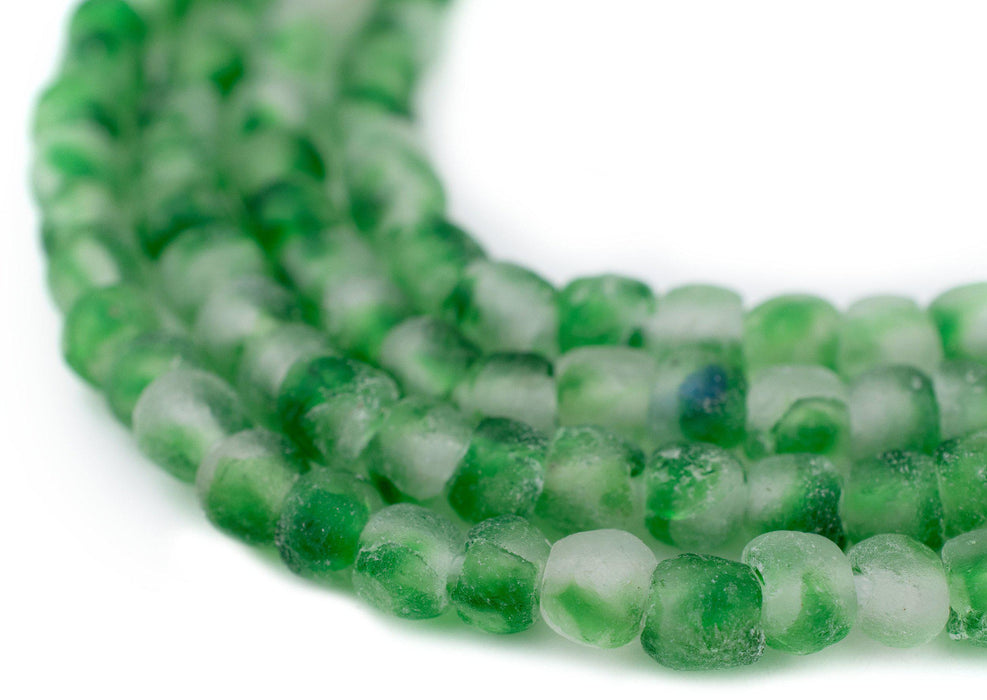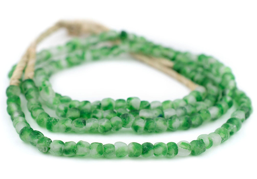 These bright and stylish handmade strands of Green Swirl Recycled Glass Beads are made in Ghana, Africa. Recycled Glass Beads like this are created by crushing glass into a fine powder and then heating it until the glass particles fuse together. The glass is then poured into a mold and baked in an oven until the glass begins to retain its shape. Each strand is about 24" in length. Each individual bead is approximately 5-8 x 7-8mm with a 1.5mm hole. Multiple strands pictured. Each strand is sold separately. Shade of green and pattern may slightly vary from strand to strand. Take a strand home for yourself today!