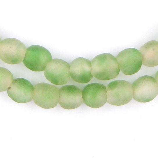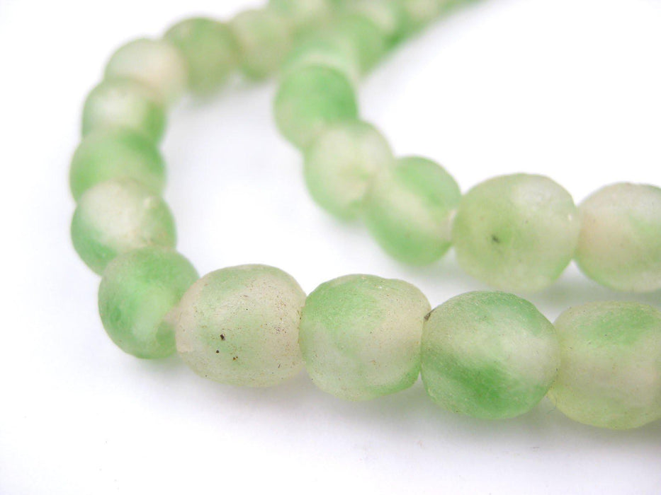 Recycled glass beads are a type of indigenously produced African bead from Ghana West Africa. These beautiful green color recycled beads are made using an old method that has been used for centuries. The glass itself is derived from a variety of recycled sources including old beverage and medicine bottles. The procedure for making the beads consists of a number of steps whereby powdered glass is poured into molds of clay and baked in a specialized oven. These beads are produced in large part by the Krobo tribe and through recycling glass are environmentally friendly.