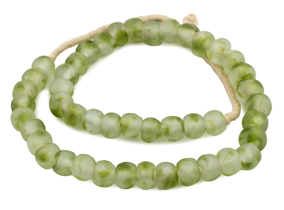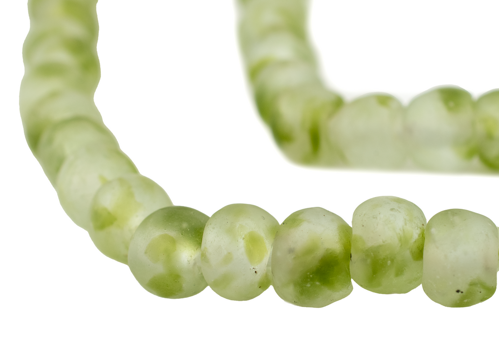 These great beads are made by the Krobo People of Ghana, Africa. Powder glass beads are made by crushing glass to a fine powder and heating it so that the particles fuse together. The glass is then poured into clay molds, with a cassava leaf stem used to make the hole. They are baked in an oven and the glass fuses and the cassava stem burns up. This technique has been used in Africa for centuries.