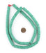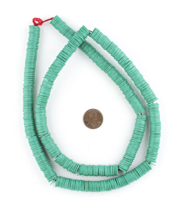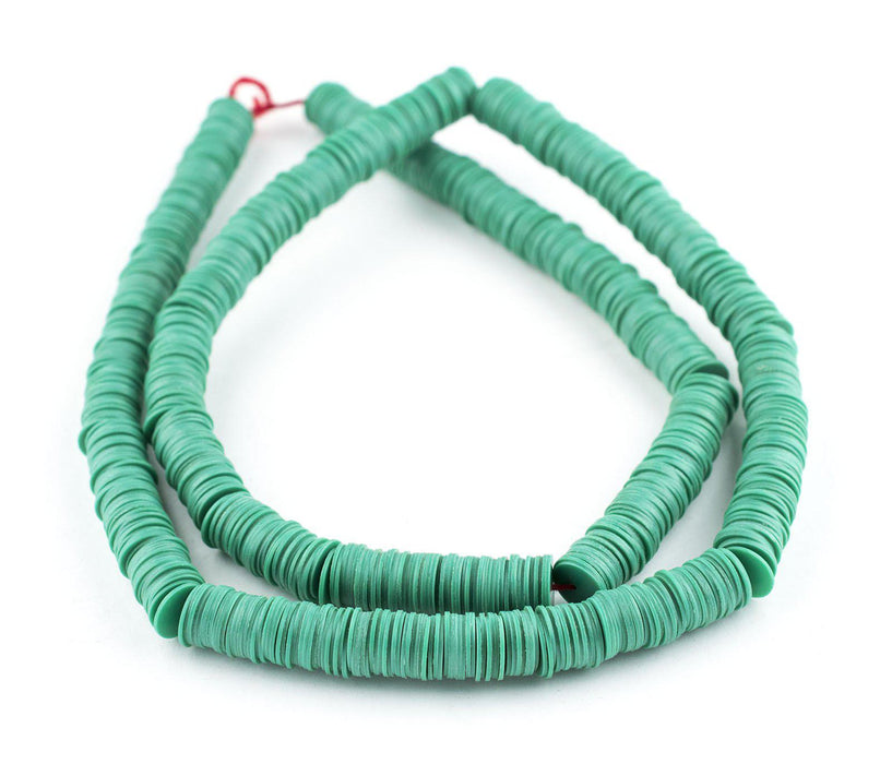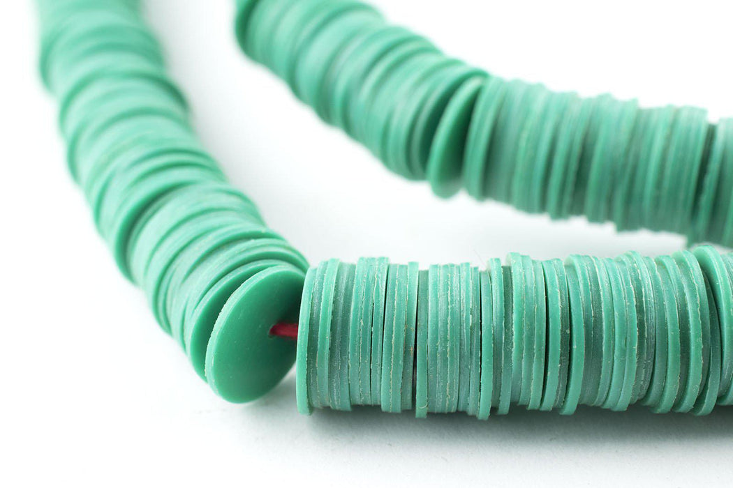 Take a look at this beautiful strand of African vinyl beads in a green color. Beads such as these are found in Ghana and Nigeria where they are sometimes worn as waist beads. Older versions of vinyl beads were said to be made from recycled phonograph records. This strand measures approximately 29" long with individual beads measuring 1 x 10mm. These beads are light and fun to wear and also versatile for jewelry designs. Each strand is sold individually.