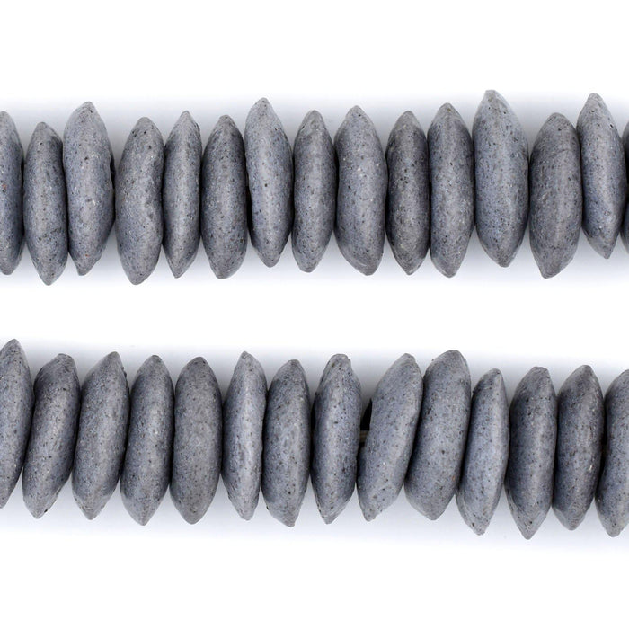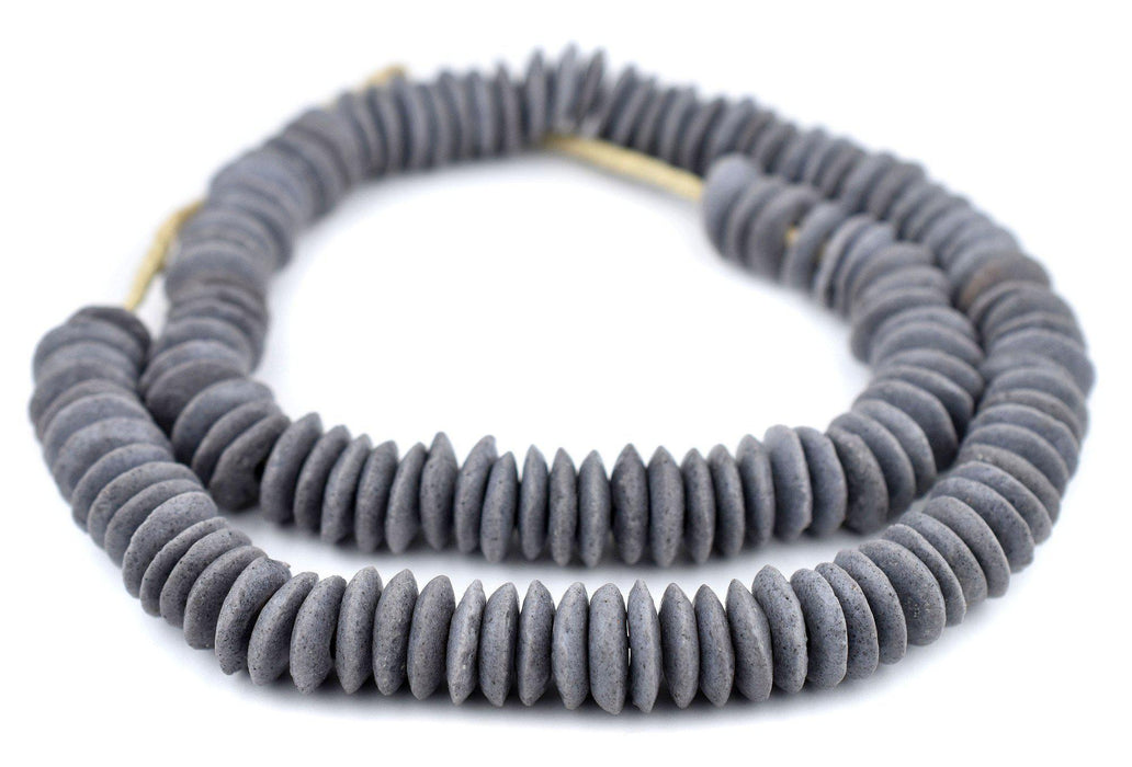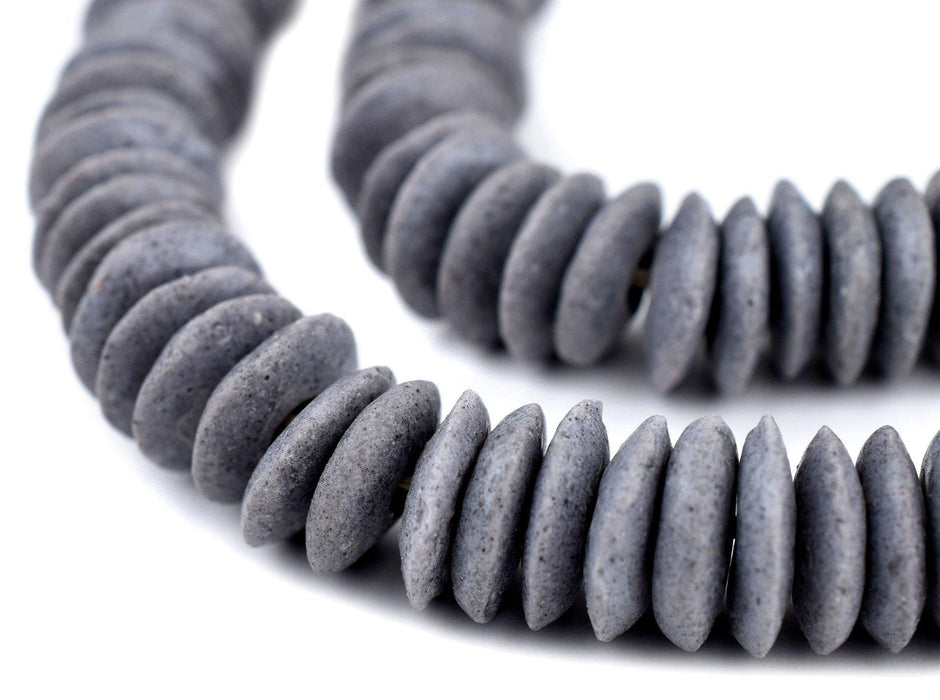 Checkout this beautiful strand of grey color Ashanti glass saucer beads. The process of making these beads is unique to Africa and has been used for over 1000 years. Pulverized glass of various colors is poured into a clay mold, using a cassava stem for the bead's hole. The mold is placed in a furnace and heated until the glass particles congeal without actually melting and the stem burns out. The Ghanaians have been making beads in this manner since the 1600s. Each bead measures approximately 4-5 x 16-18mm. Get yours today!