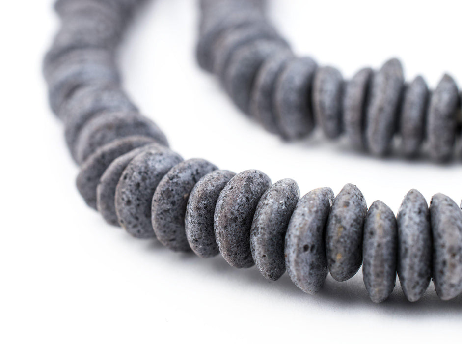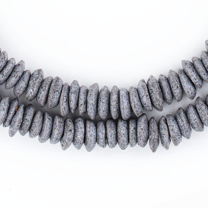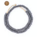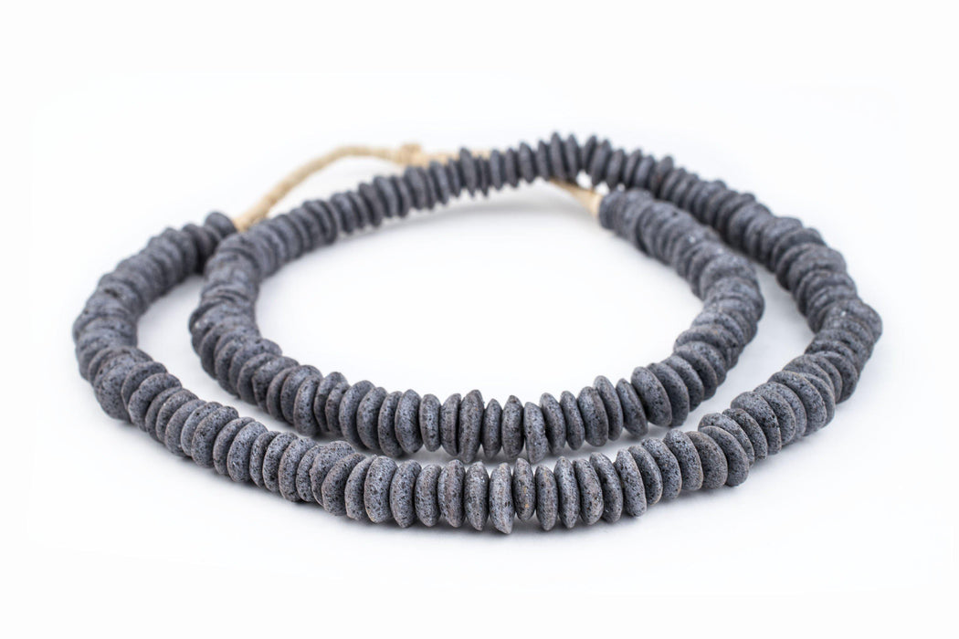 Checkout this beautiful strand of grey Ashanti glass saucer beads. The process of making these beads is unique to Africa and has been used for over 1000 years. Pulverized glass of various colors is poured into a clay mold, using a cassava stem for the bead's hole. The mold is placed in a furnace and heated until the glass particles congeal without actually melting and the stem burns out. The Ghanaians have been making beads in this manner since the 1600s. Each bead measures approximately 2-3 x 8-9mm in size, with strands measuring approximately 24". Beautiful beads at a great price!