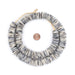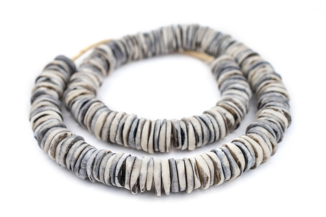 These grey bone beads are designed in the spirit of traditional Nigerian coconut heishi. While these beads seem nearly identical to their wooden coconut counterparts, do not be fooled. They are made of authentic recycled bone. Looks aside, they are more durable and a bit heavier than traditional African coconut beads. Each bead measures approximately 3-4 x 16-18mm, with a hole size of 2mm. Each strand measures about 29" in length. Shade of grey may vary slightly from photo. Unique find!